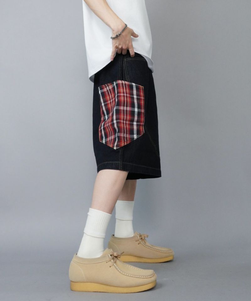 チェック切り替えが目を引くデニムハーフパンツが新登場。