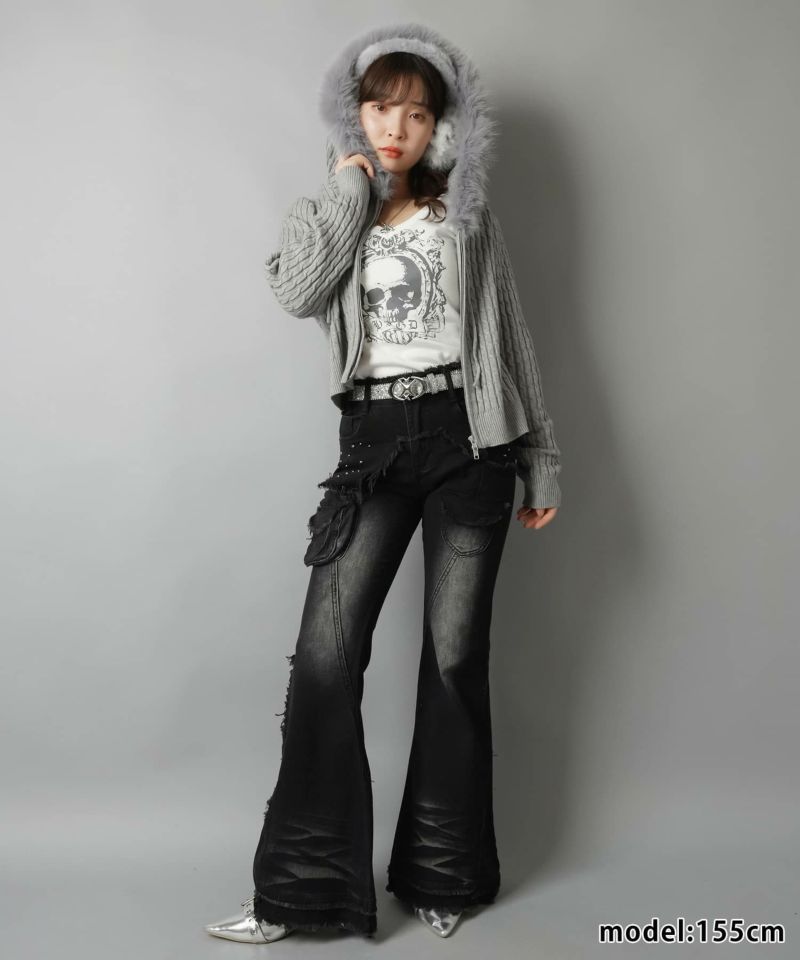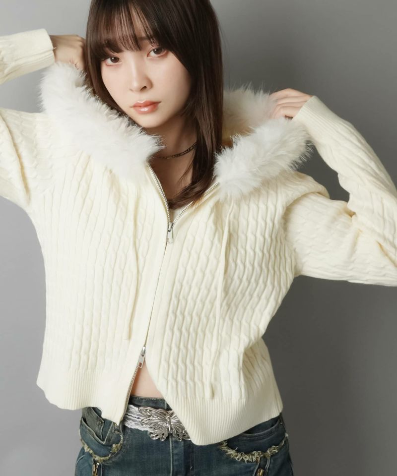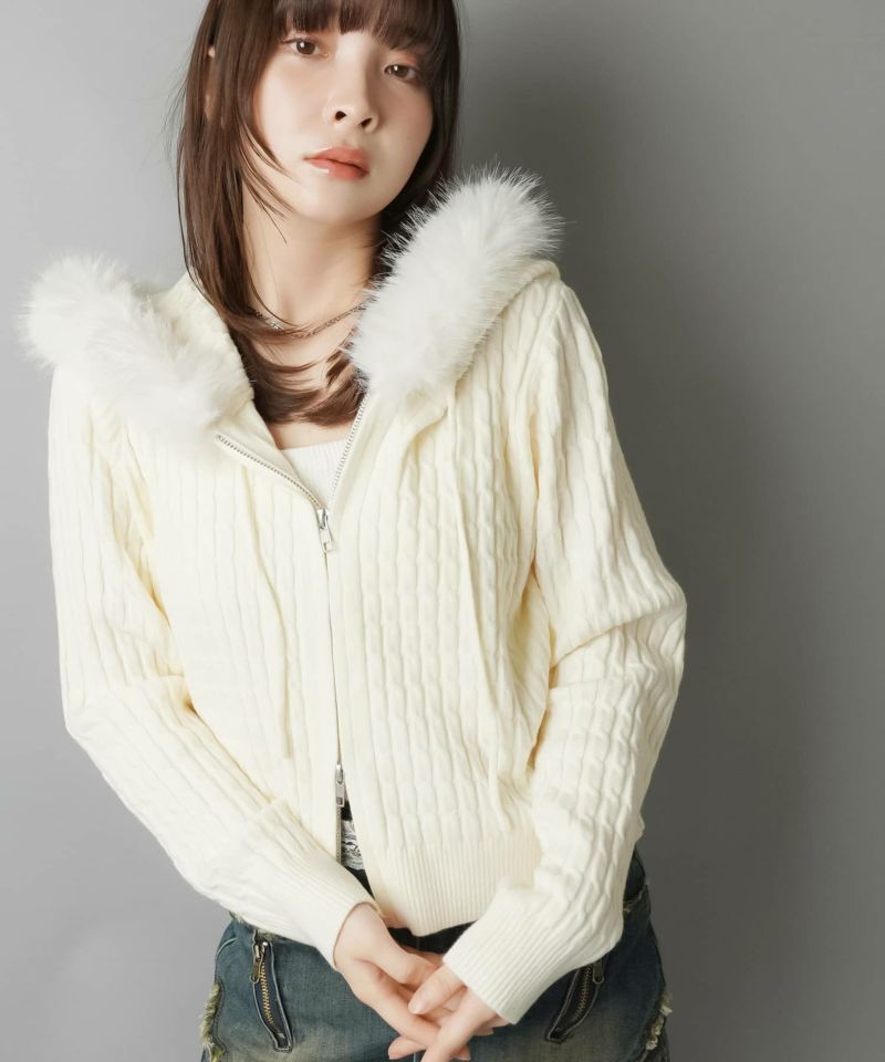 ケーブル編みの立体感と、存在感たっぷりのファーフードがポイントのジップニット。