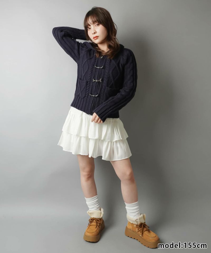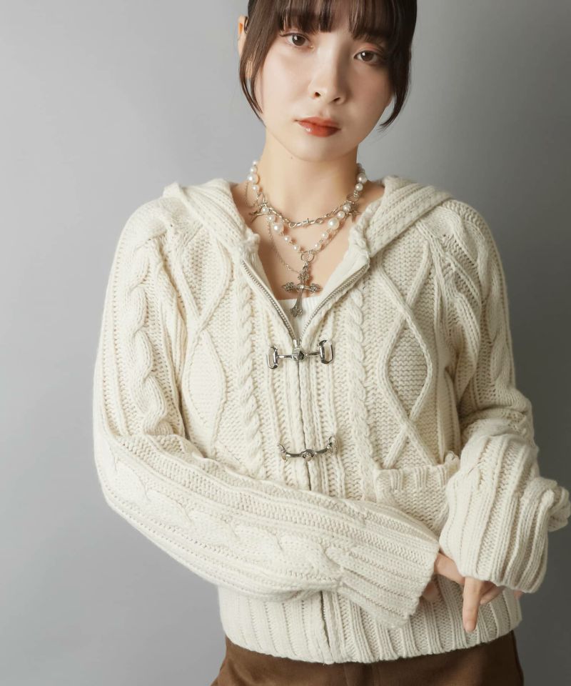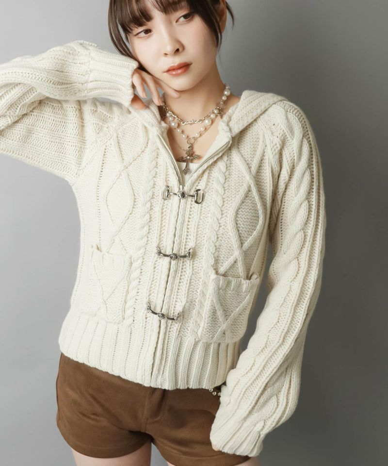古着感のあるベルトボタンデザインがポイントの、フード付きWジップニットカーディガン。