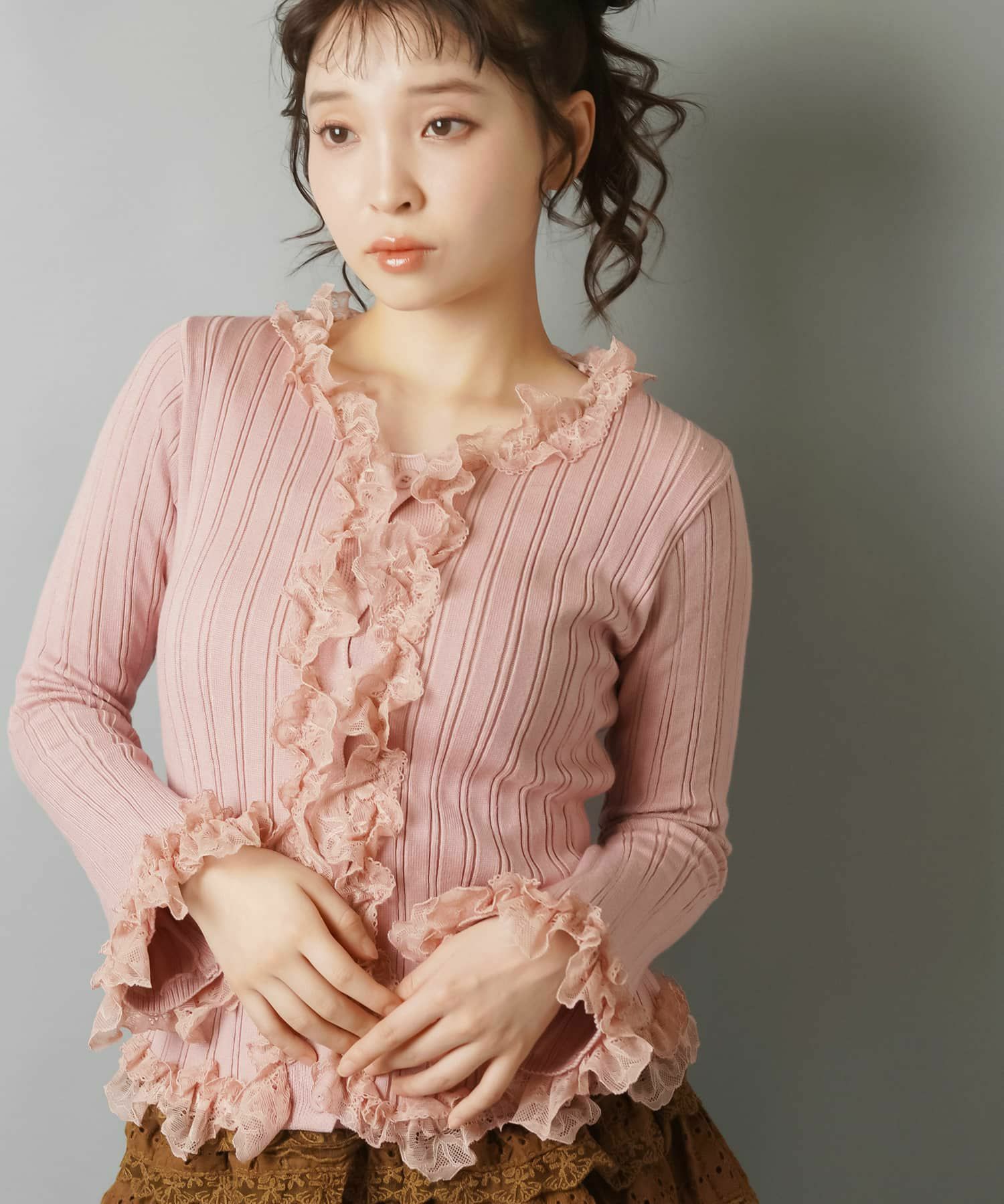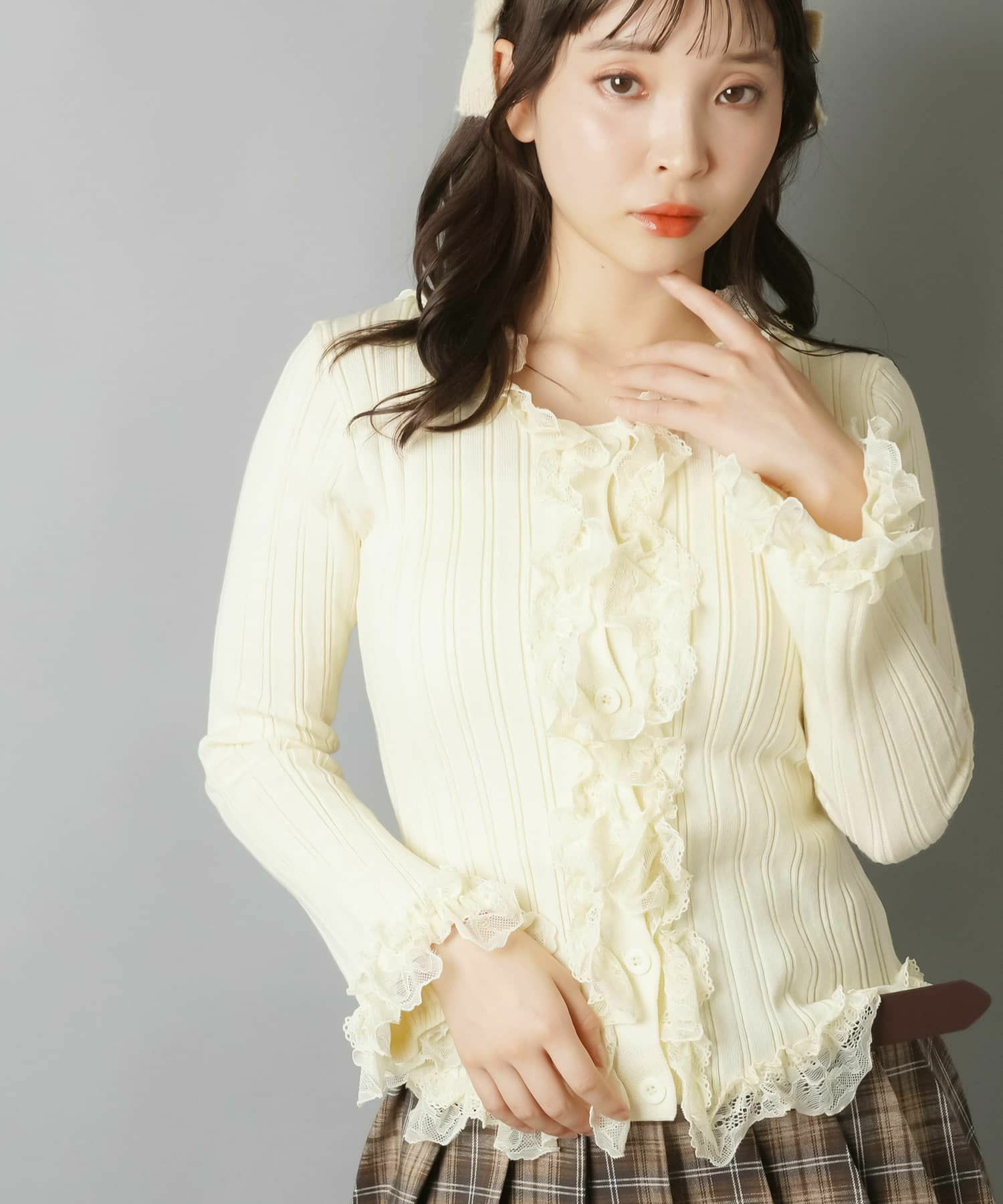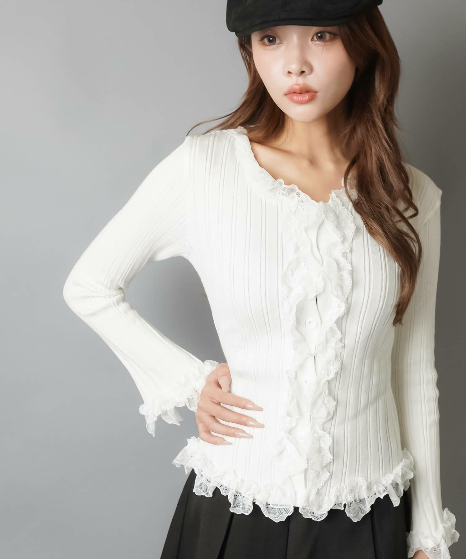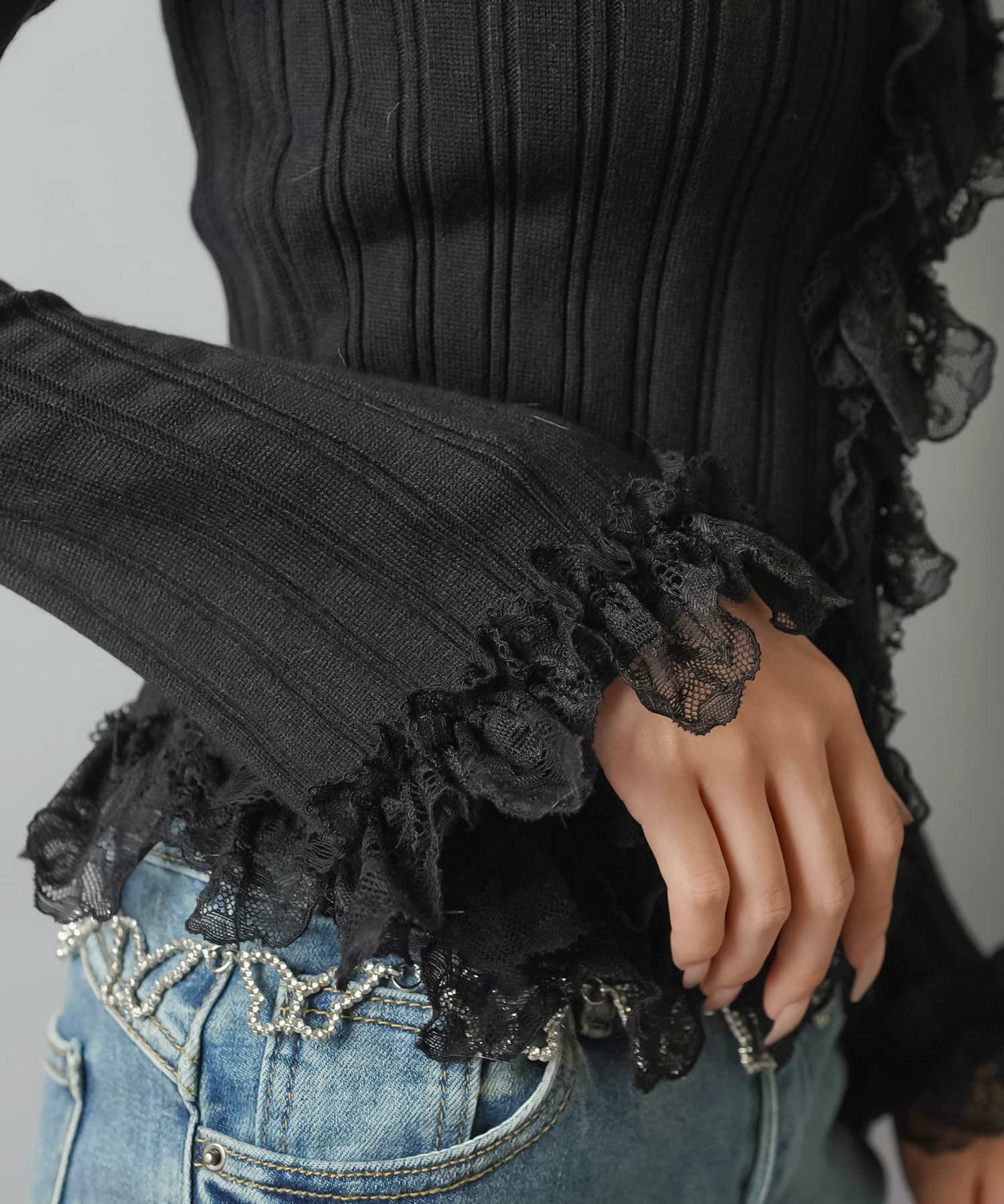 【立体感のあるリブと華やかなレースフリルがフェミニンさをプラス?】