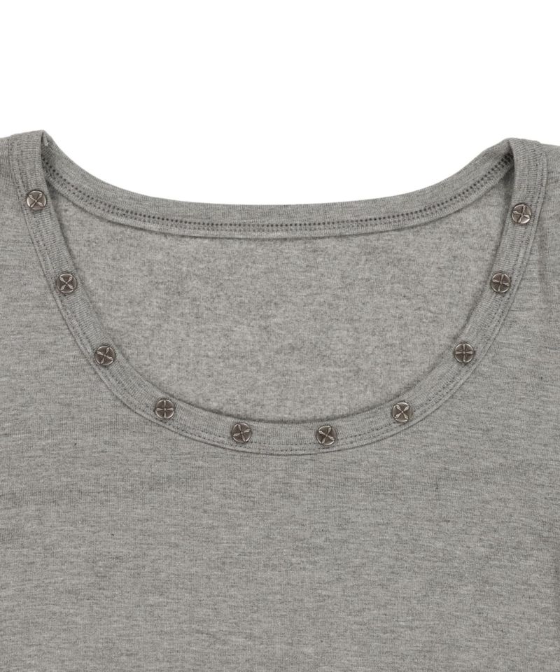 胸元にあしらったメタルスタッズがキラッと光って、シンプルながらもおしゃれ見えするデザイン。