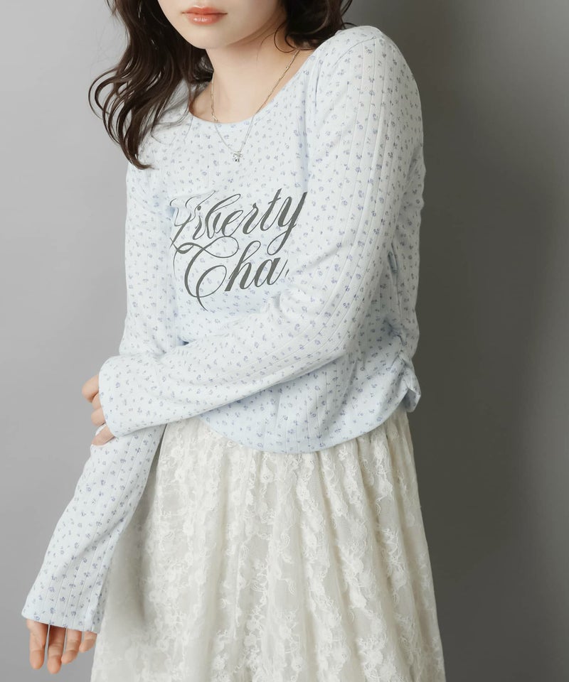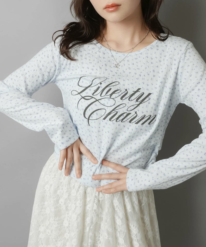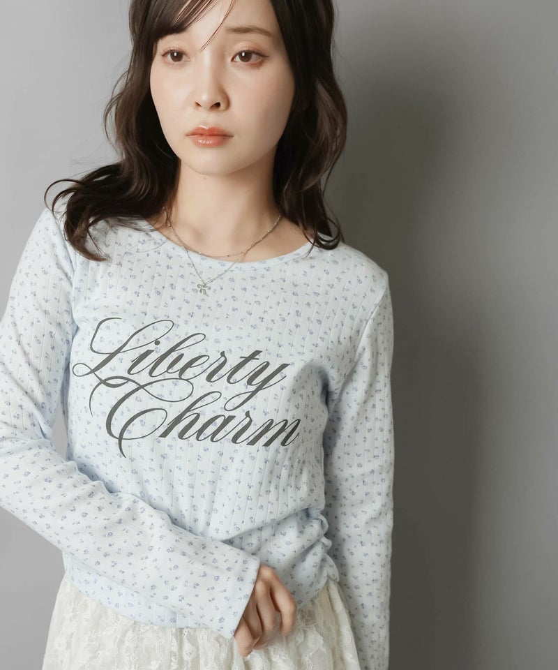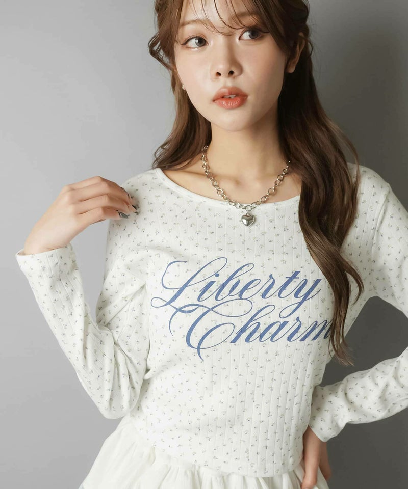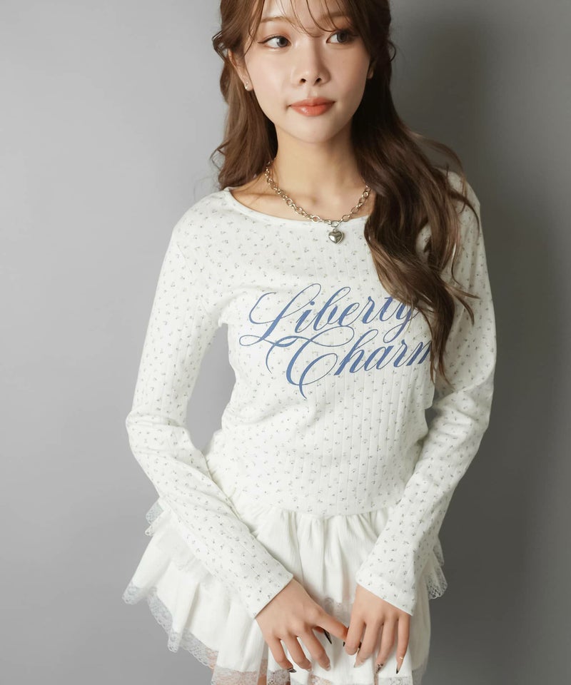 小花柄とロゴデザインが目を惹く、韓国ガーリーな長袖トップス。