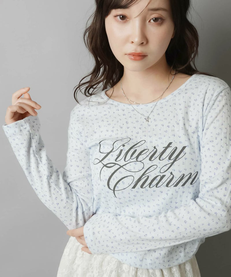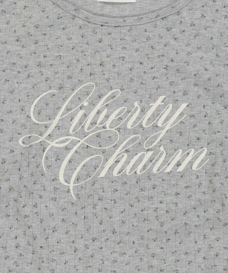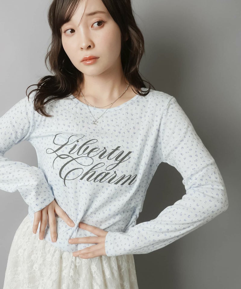 全面に散りばめた小花柄が可憐な印象を与えつつ、ロゴプリントが甘さを程よく引き締めてくれる一枚です。