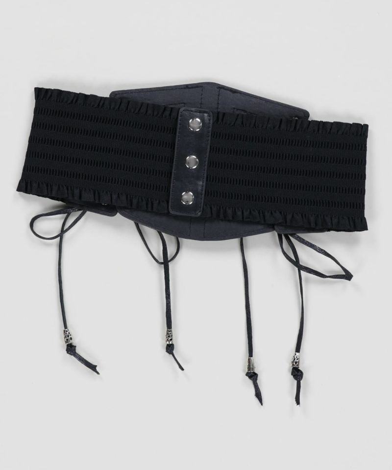 シンプルな腰回りを上品に演出するフェイクレザーコルセット。