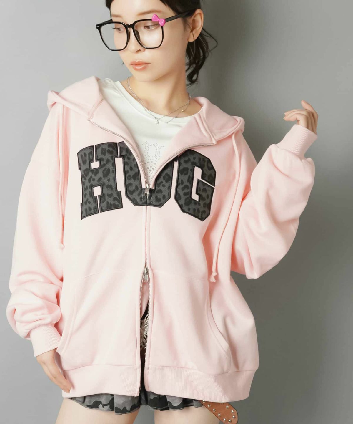 裏毛ダブルジップパーカー/ヒョウ柄ロゴ/HUG/全5色