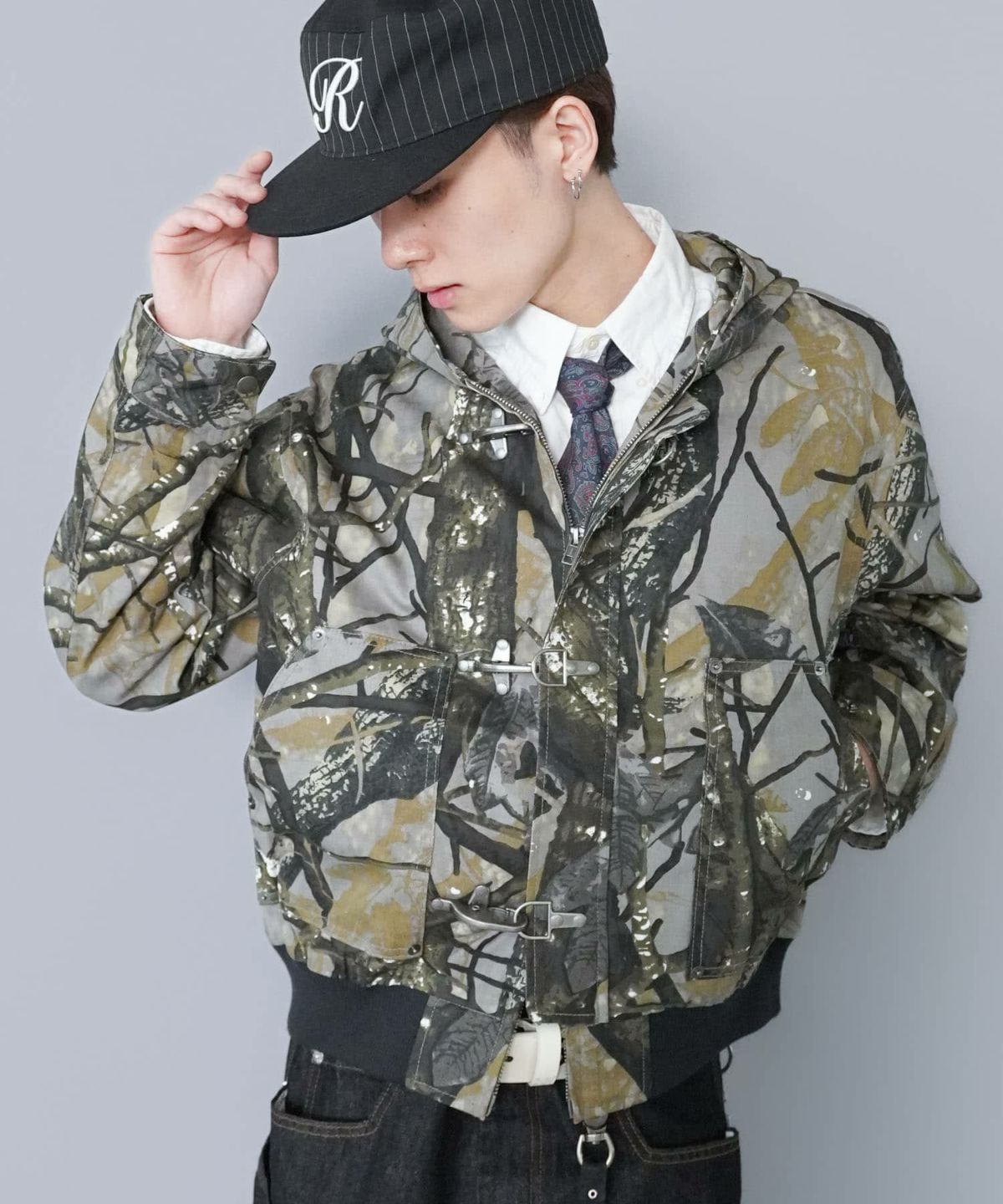 短丈ダブルジップパーカー/パッチワークカモフラロゴ/ショート丈