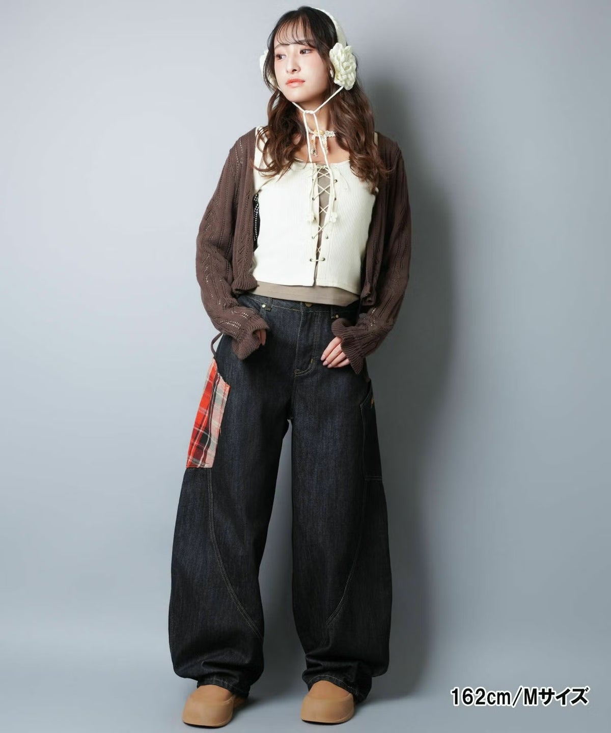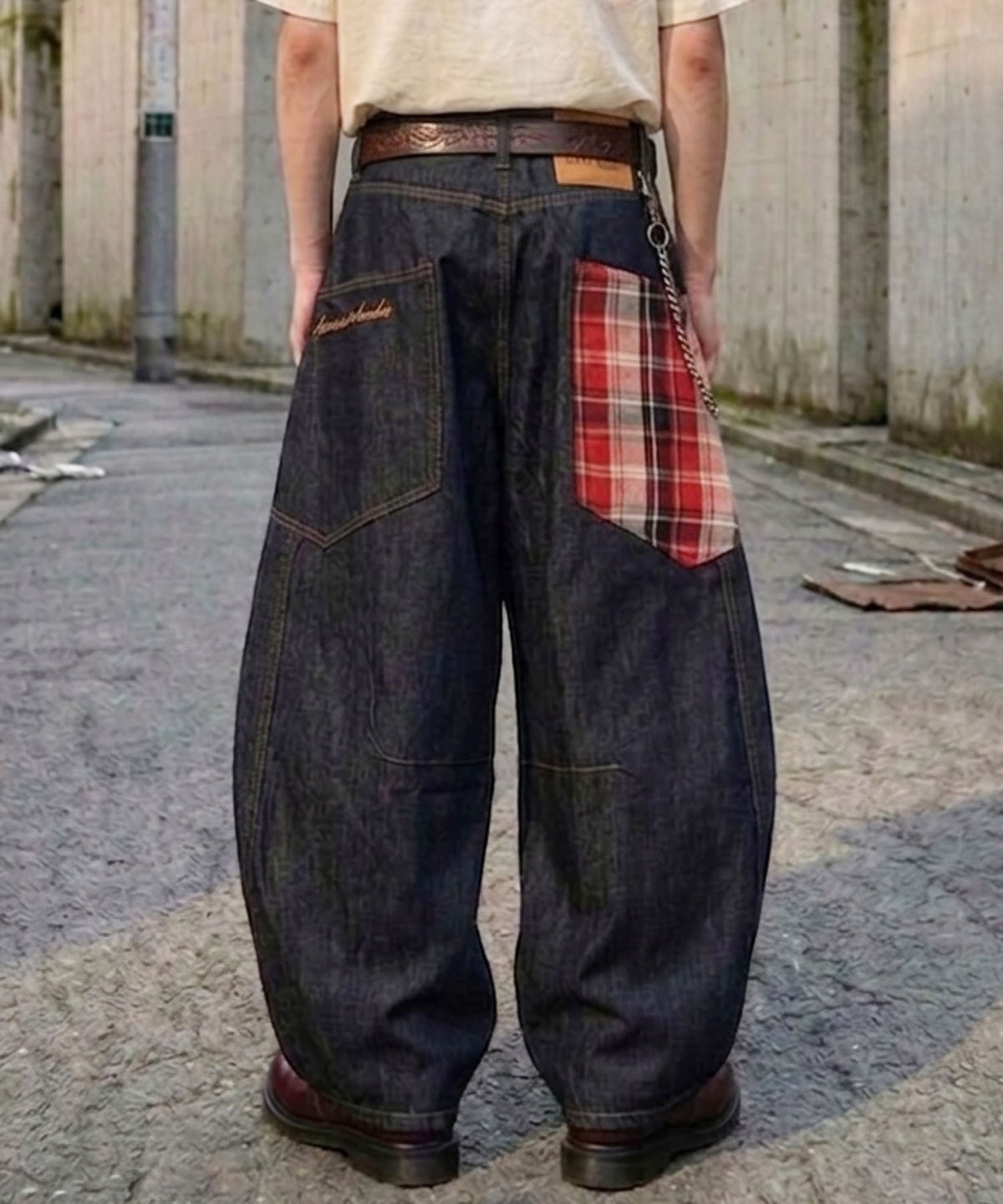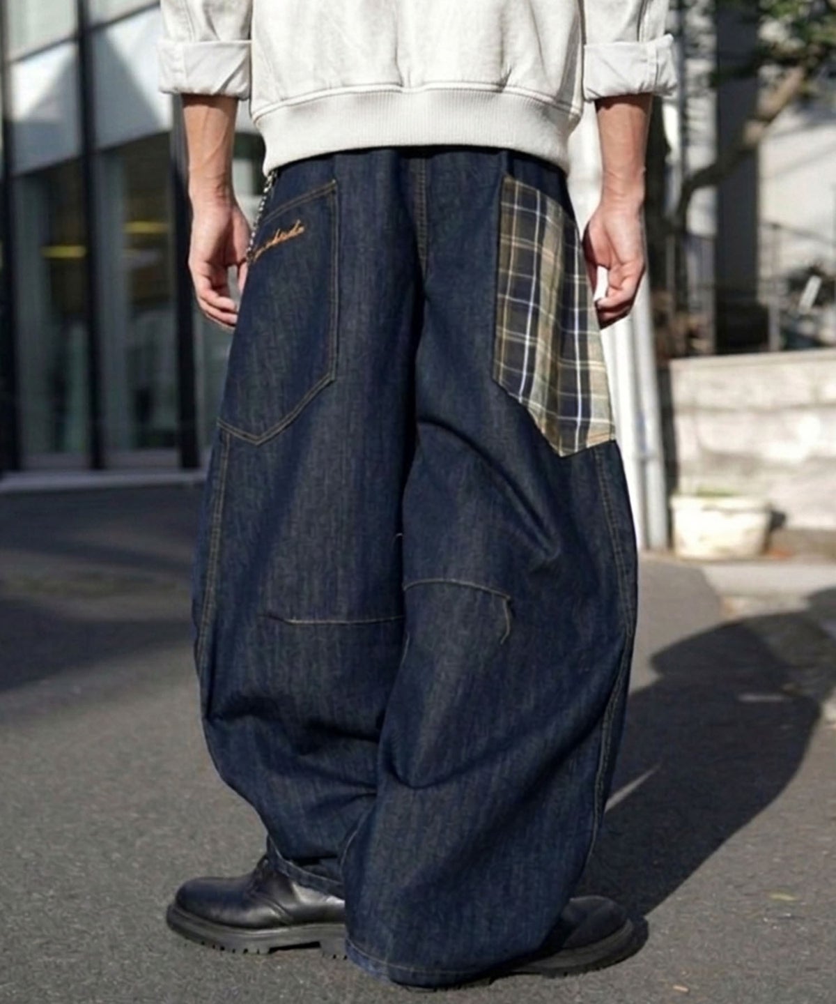 デニムワイドバルーンパンツ/チェック/バギー/カーブ