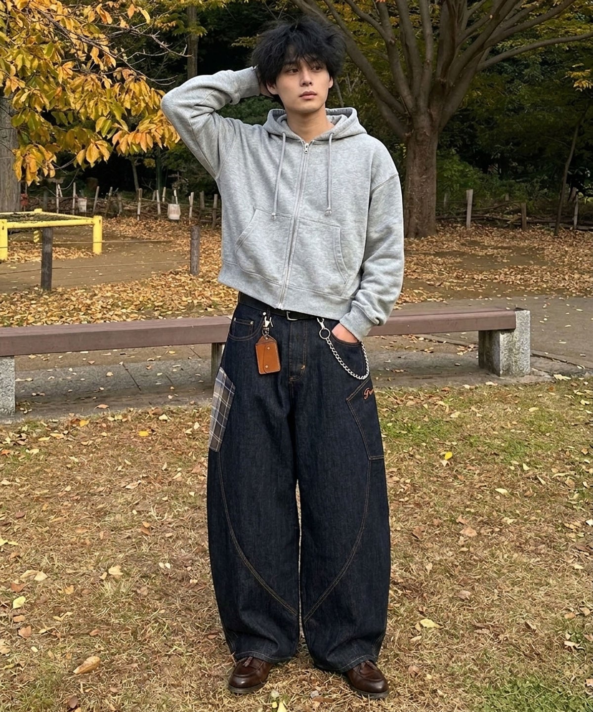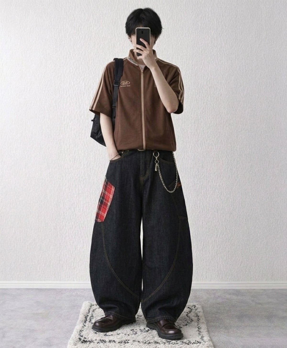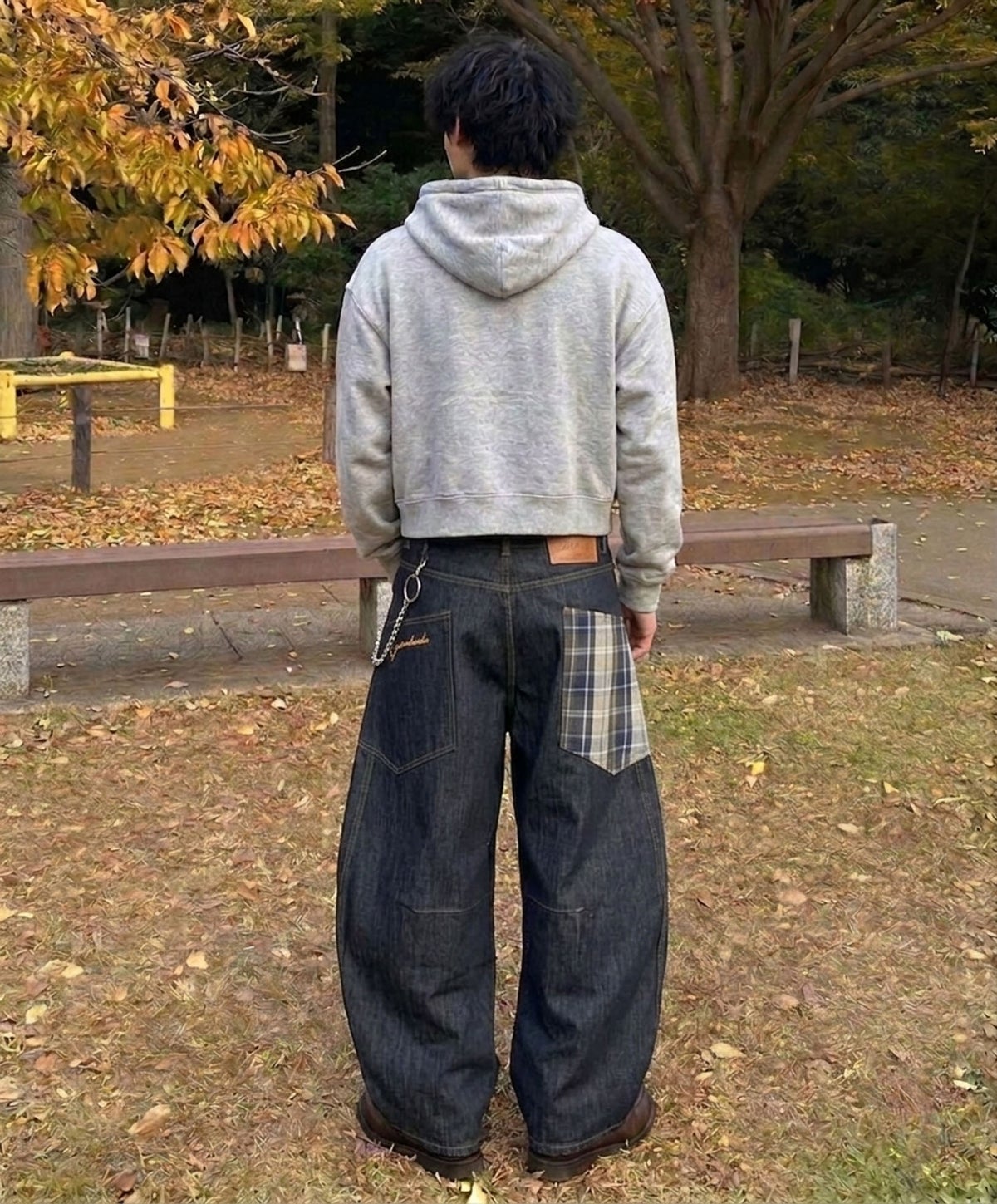 デニムワイドバルーンパンツ/チェック/バギー/カーブ