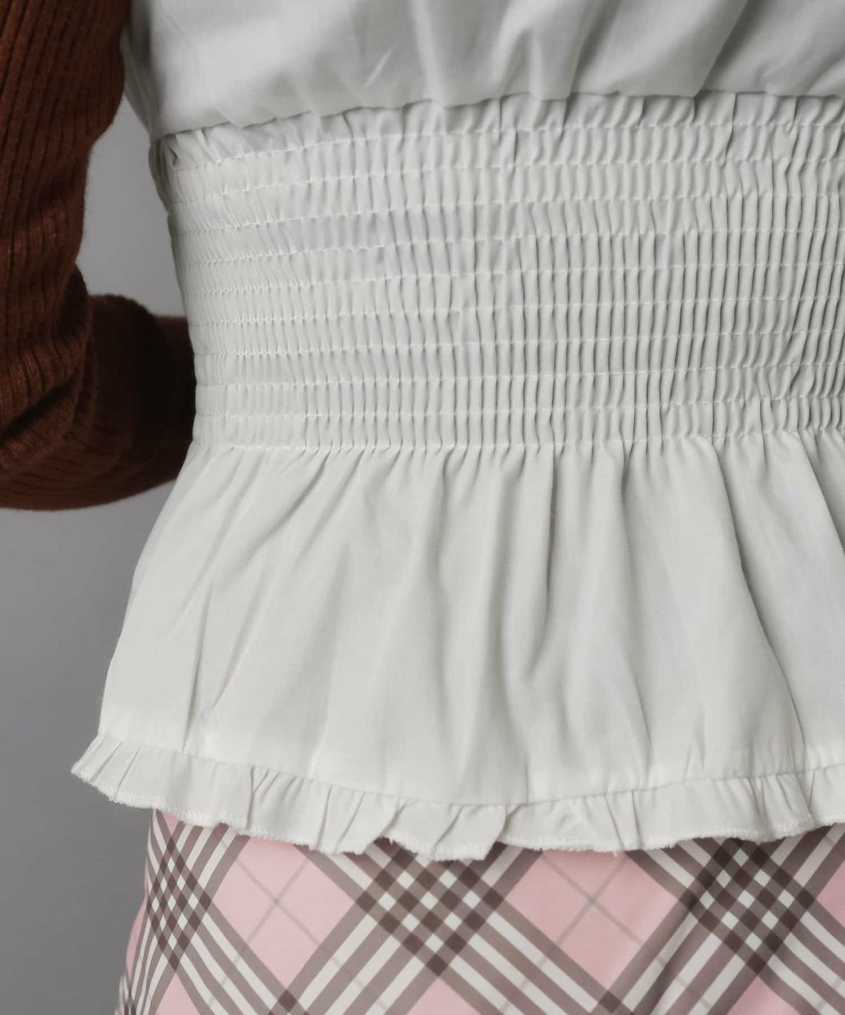 【51%OFF】長袖フリルチェックブラウス+ニットビスチェセット