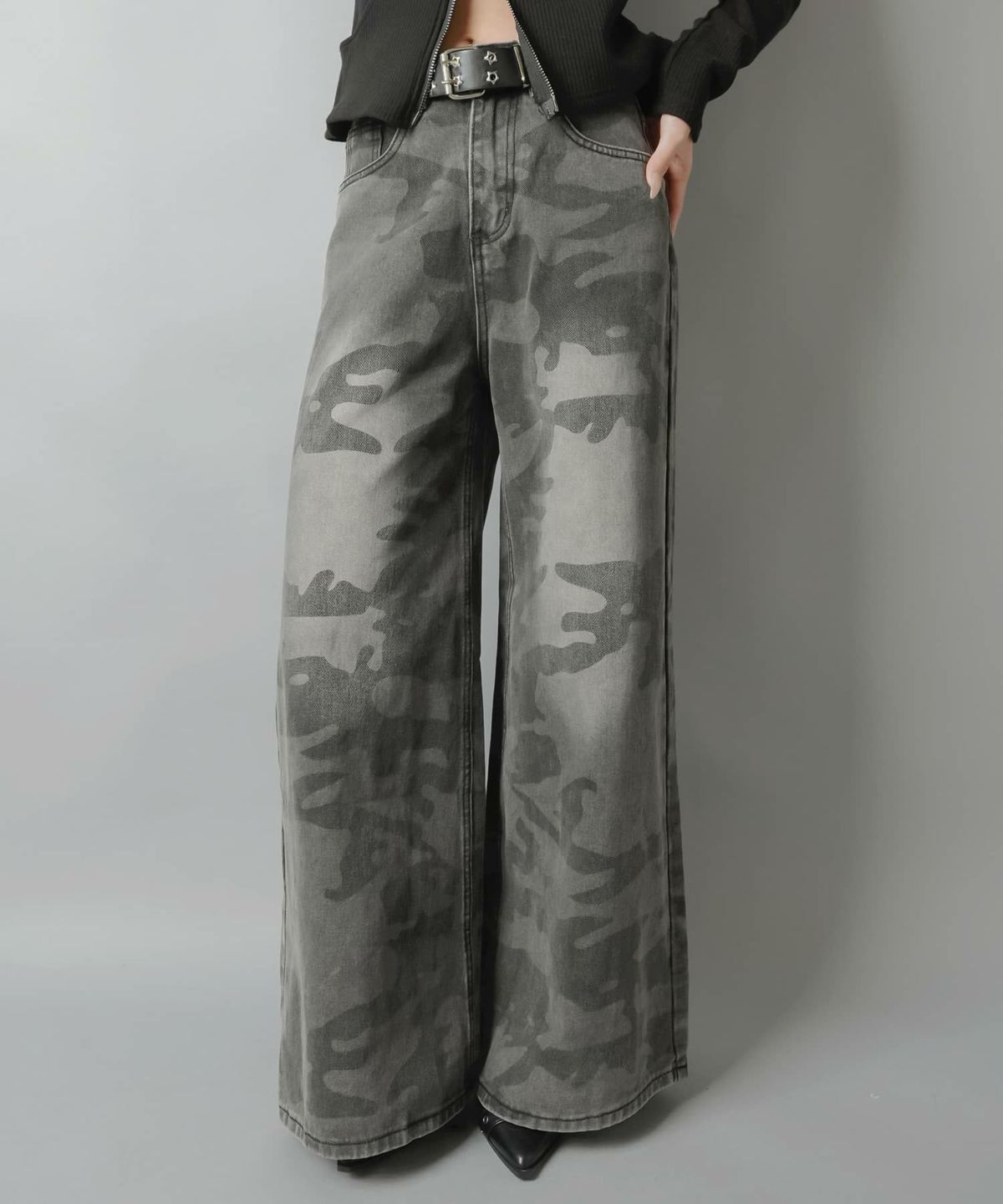 ハトメベルト付きカモ柄プリントデニムパンツ