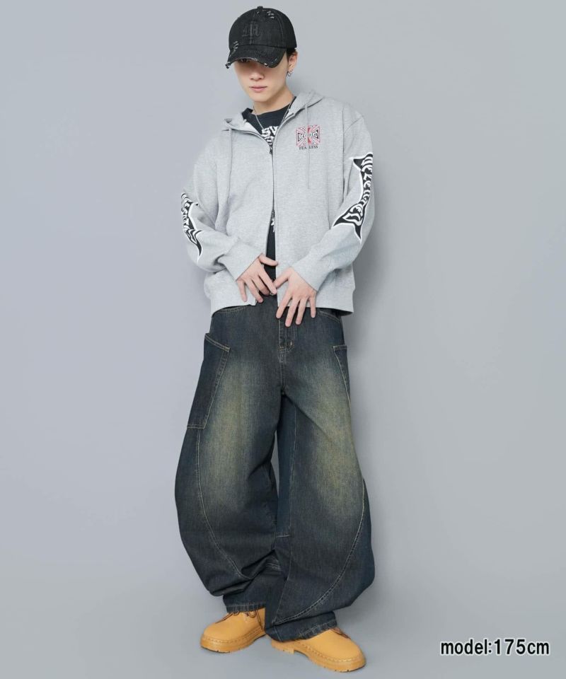 袖ロゴデザインが目を引くダブルジップパーカー。