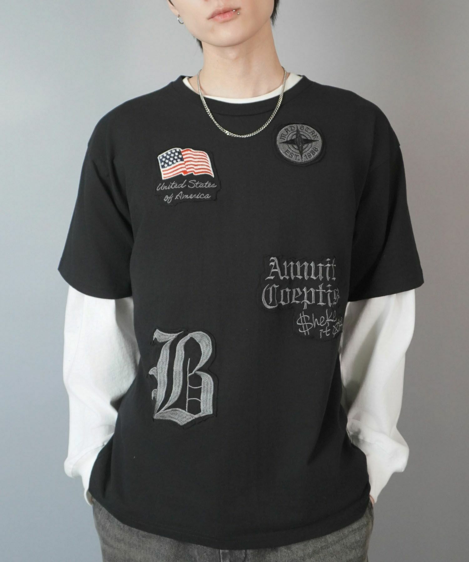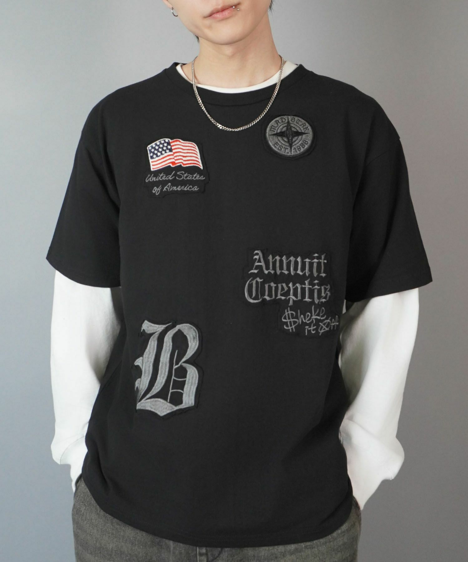 ワッペンをあしらった、ストリートTシャツ。