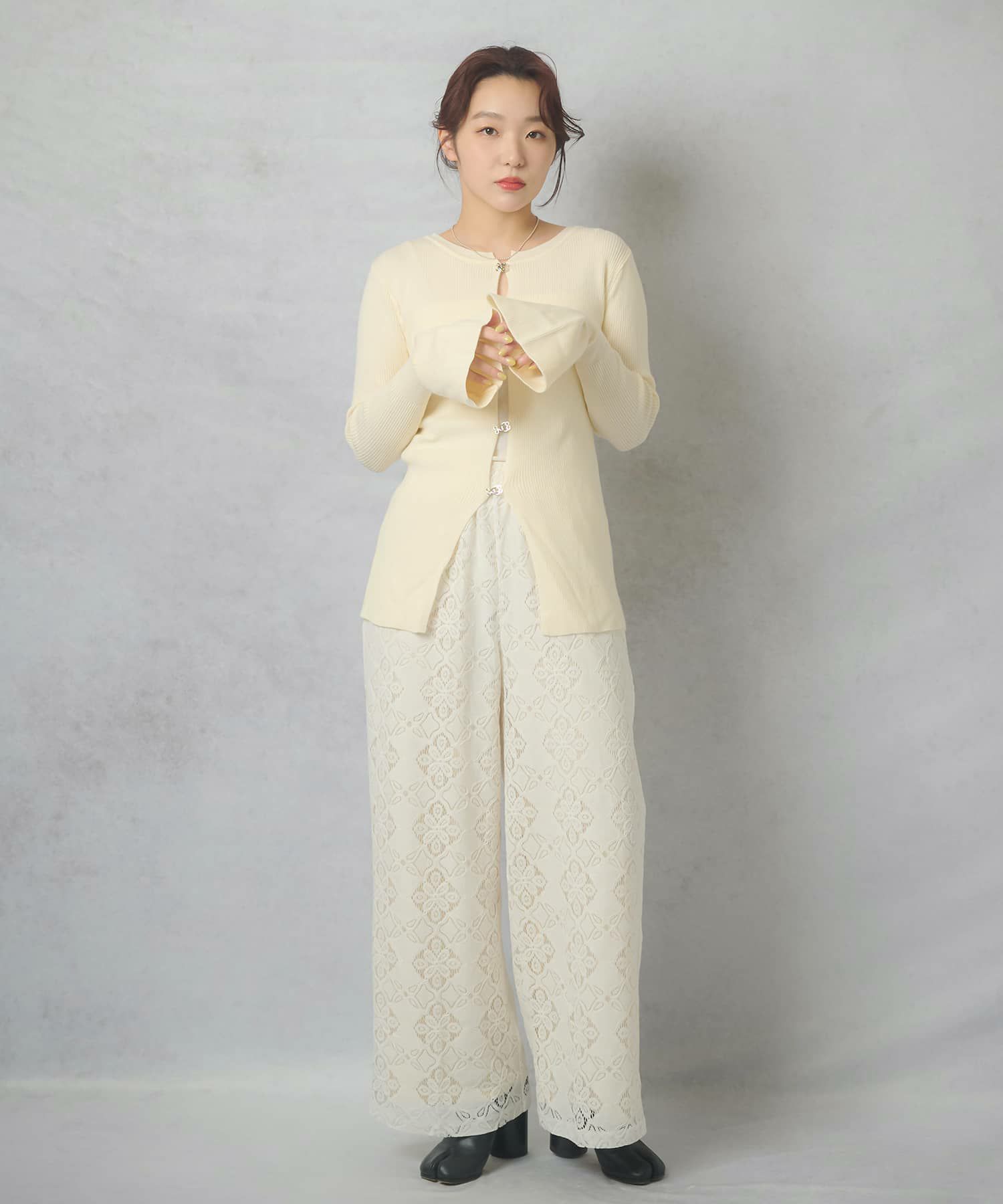 上品なレース素材が特徴で、足元までフェミニンな雰囲気を引き立てます。