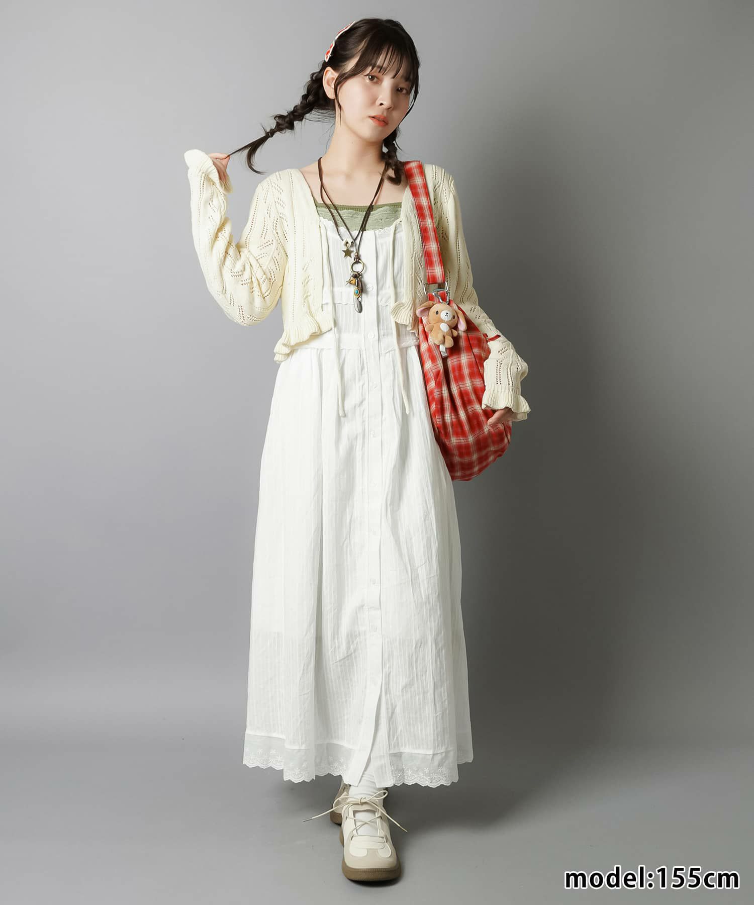 薄手のワンピースにニットベストを重ねたり、