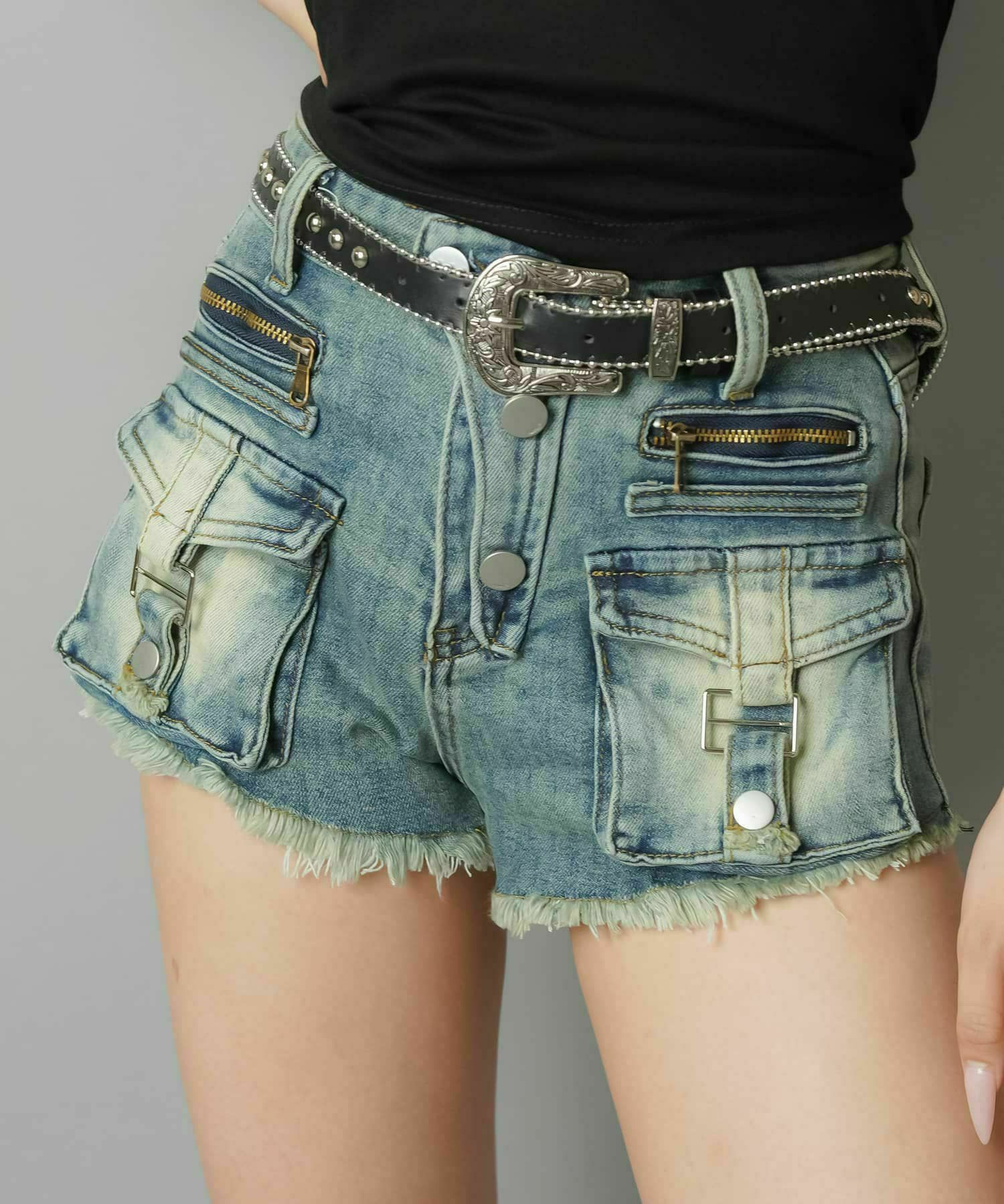 2サイズ展開 デニムショートパンツ/ポケットベルト/フリンジオーバーダイ