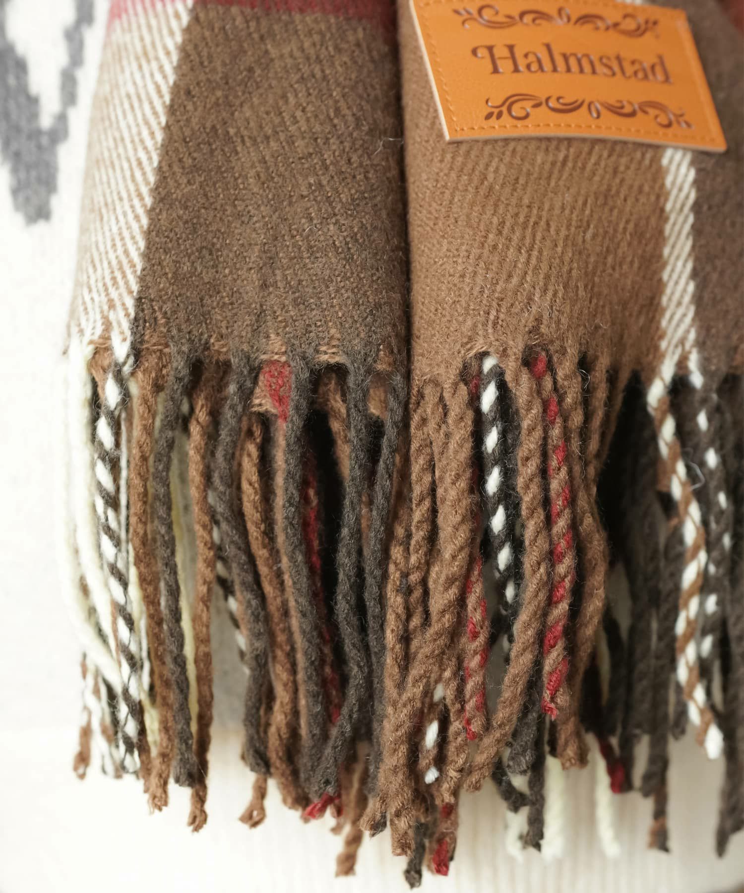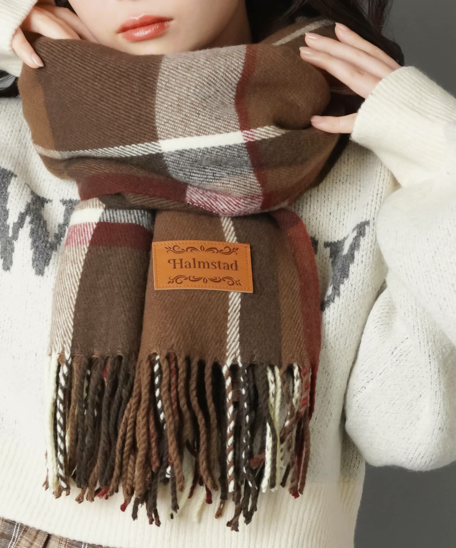 ふんわりとした肌触りと、首元をしっかり包み込む大判サイズのタータンチェックマフラー。