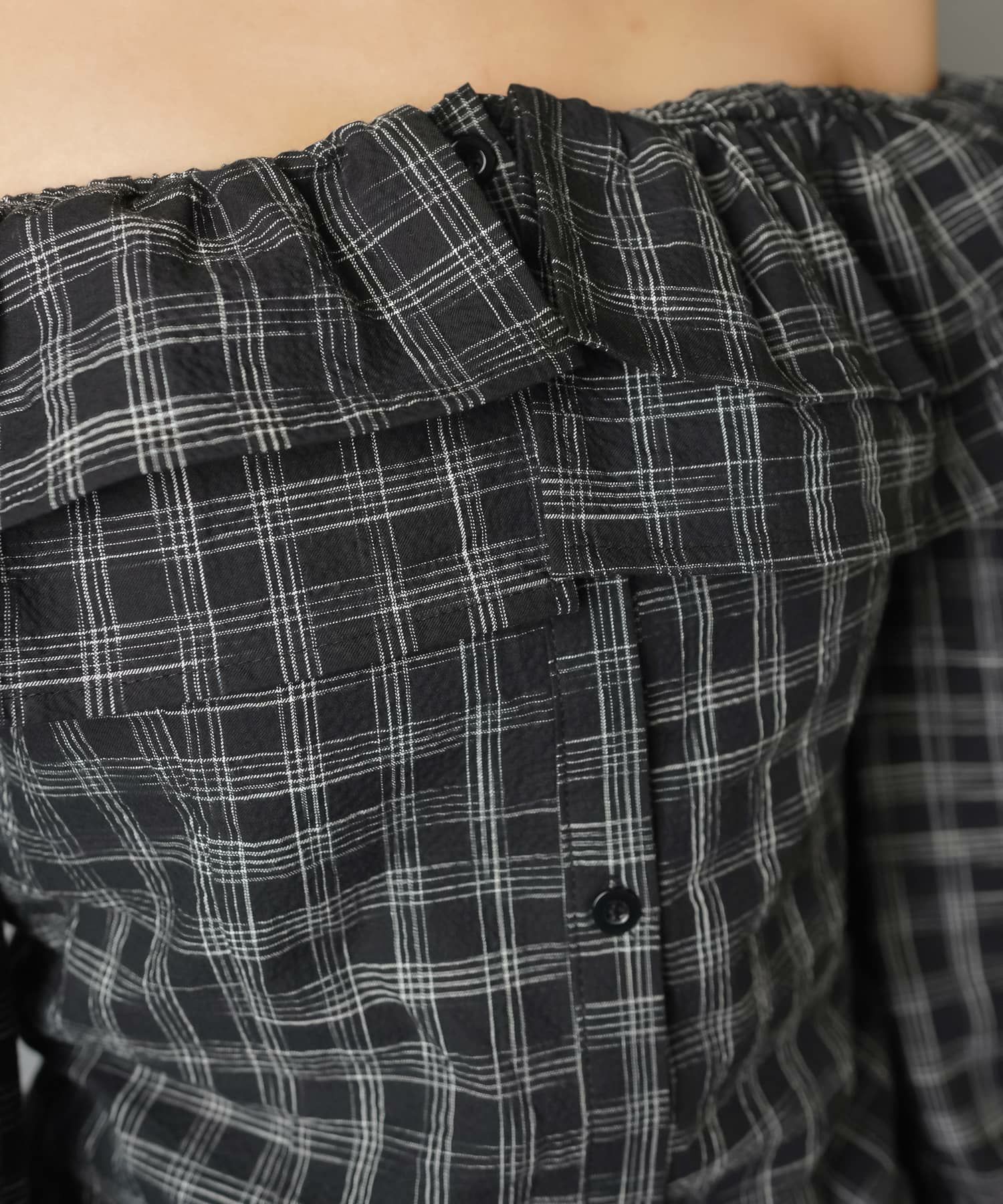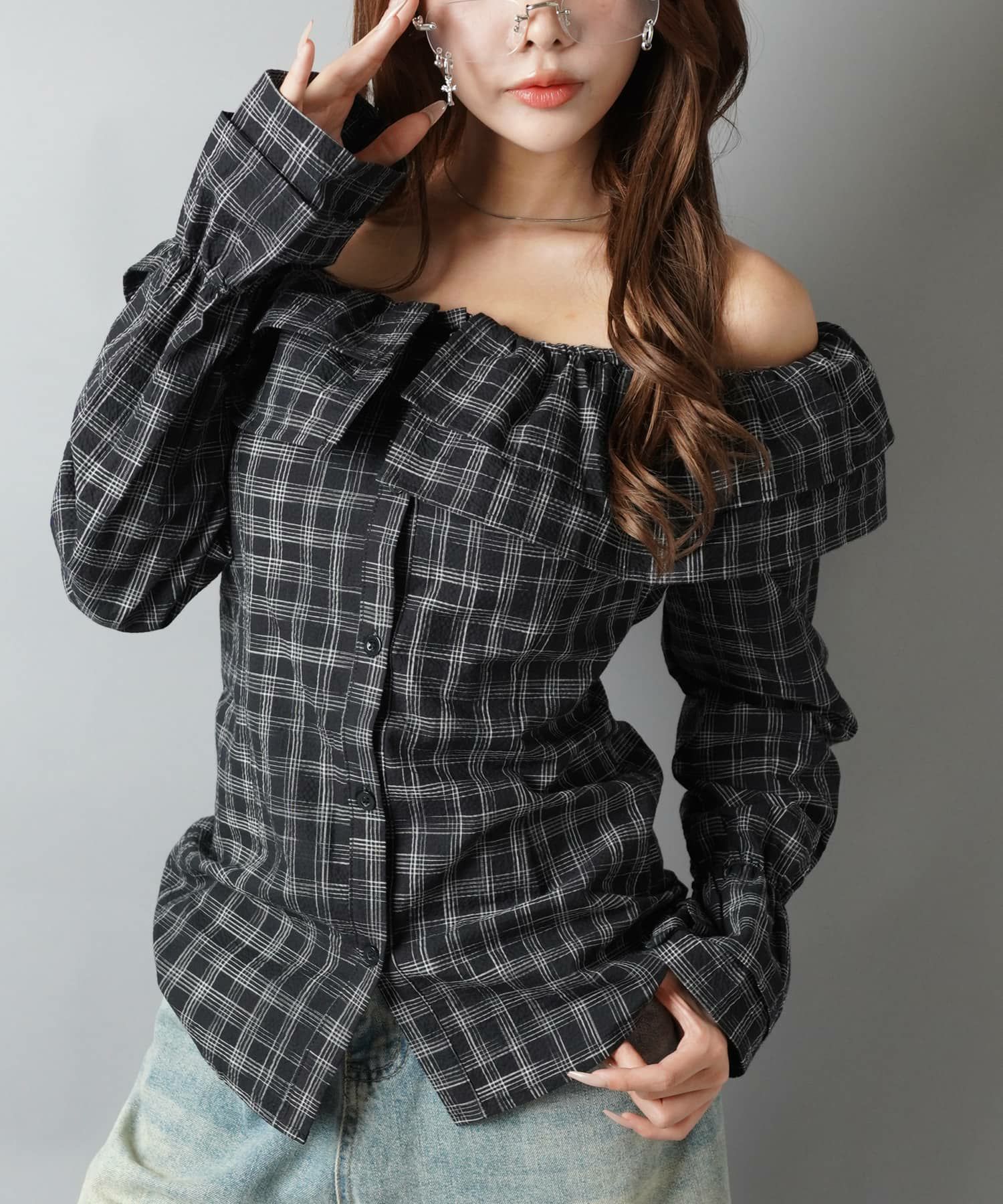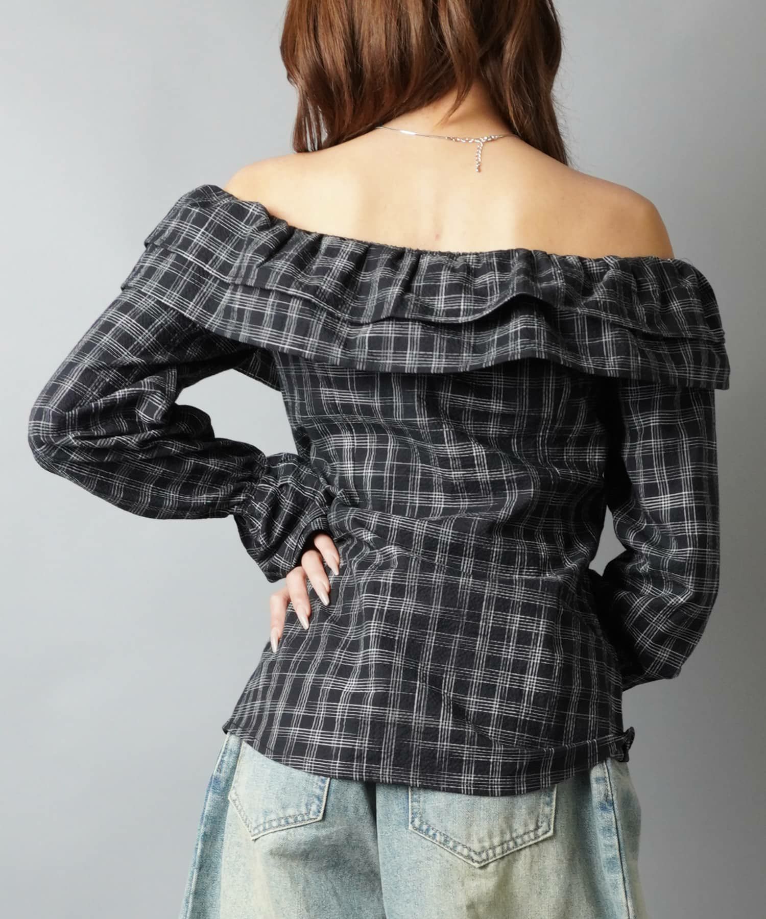 【88%OFF】オフショルダーブラウス/チェック柄