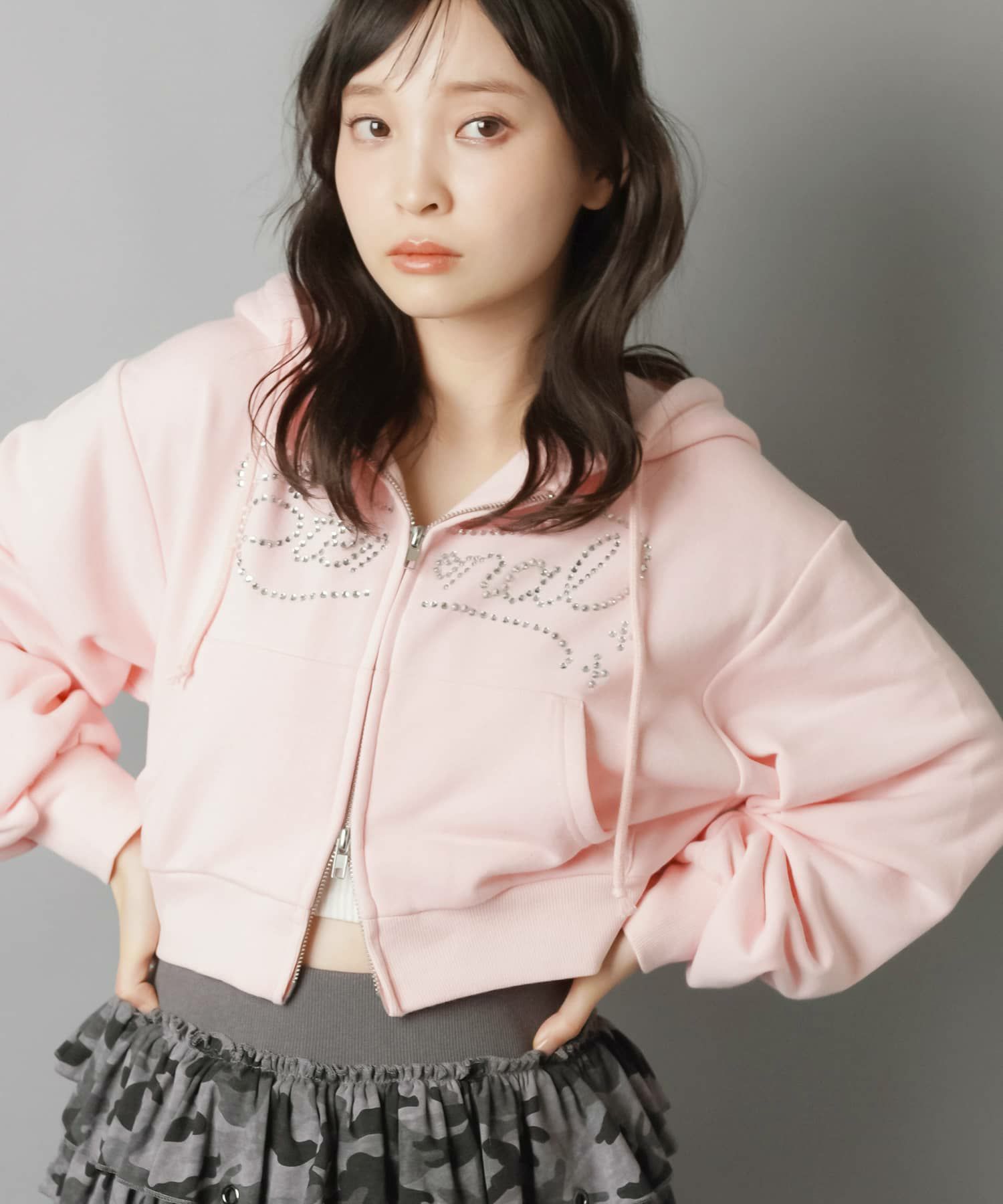【キラキラのラインストーンロゴが可愛いWジップショートパーカー】