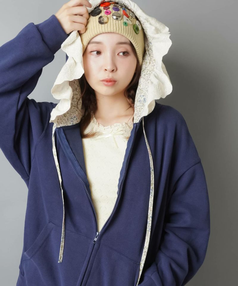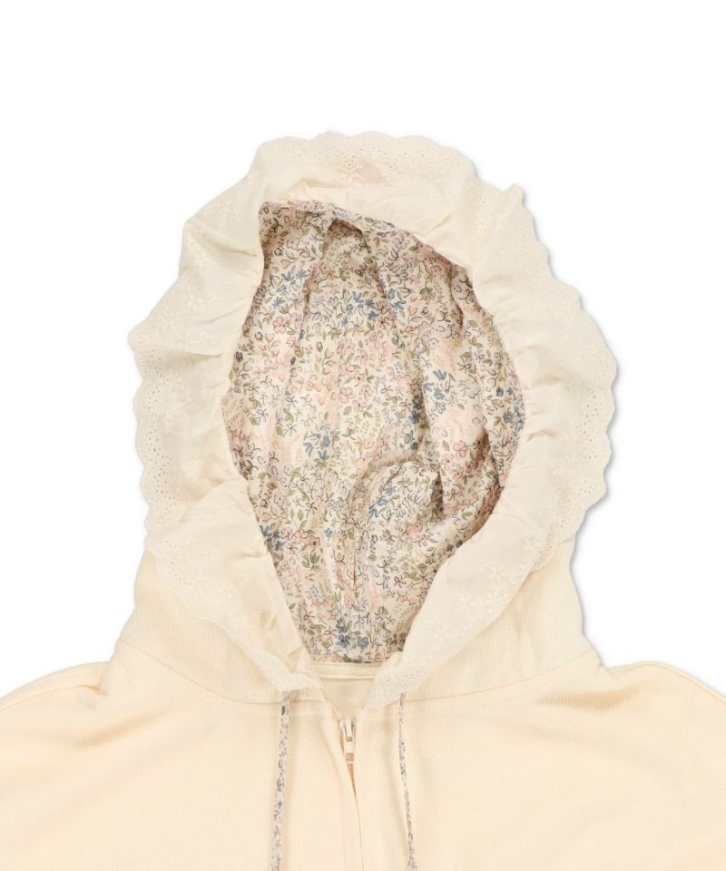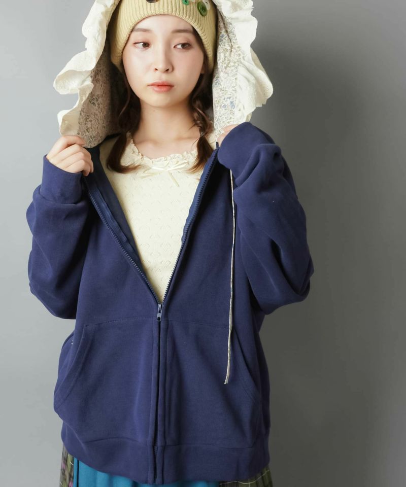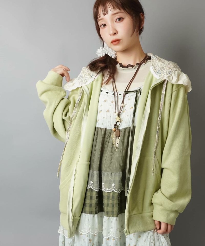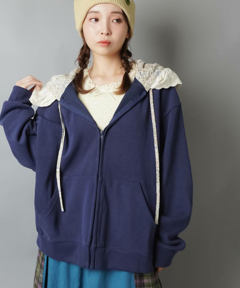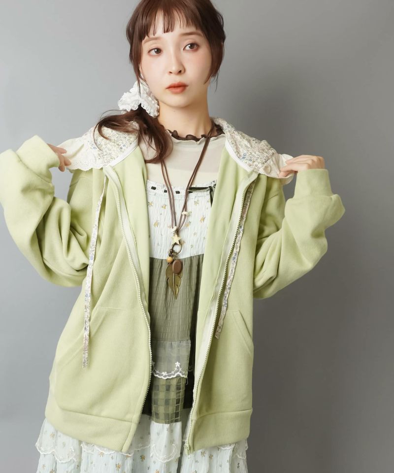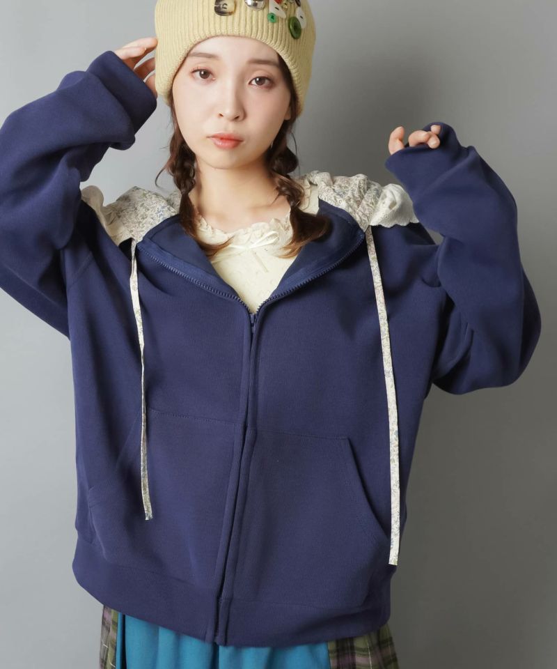 裏毛ジップパーカー/レース付きフード/小花柄/#NEO森ガール