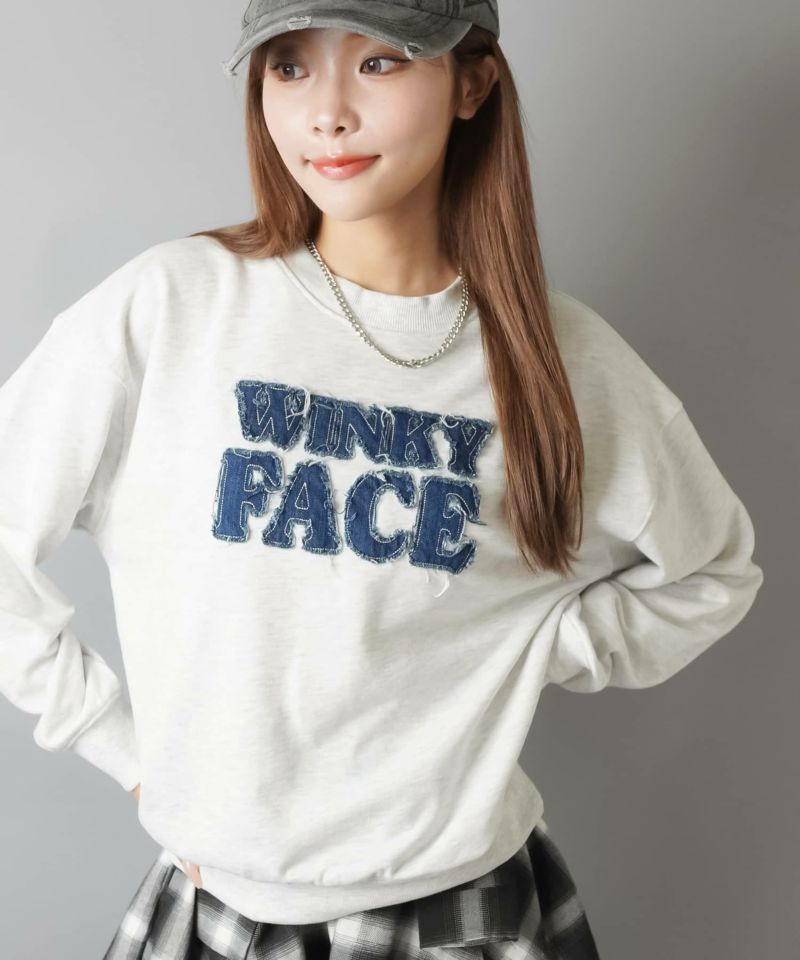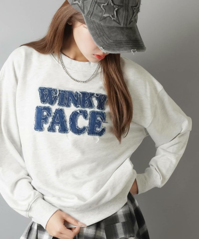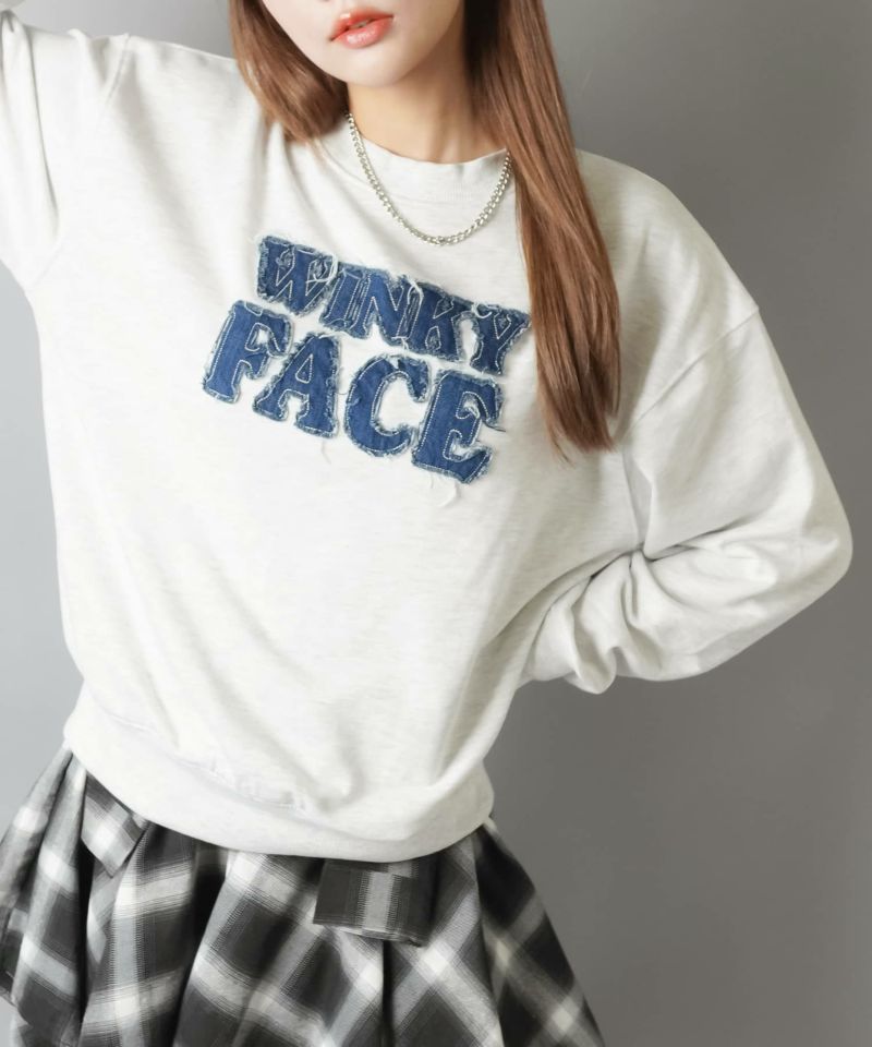 裏毛長袖スウェット/デニム貼り付けロゴ/2段