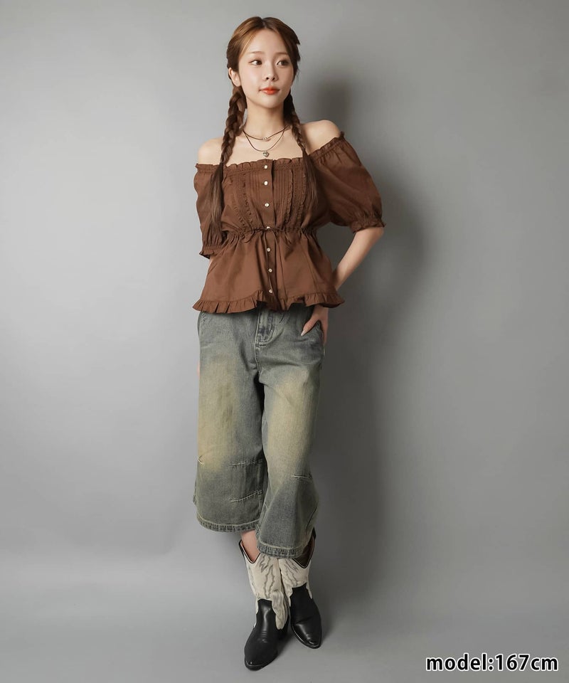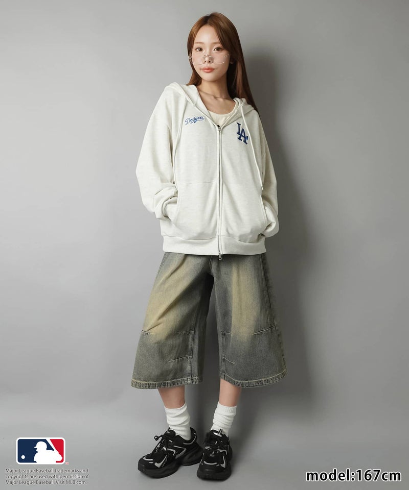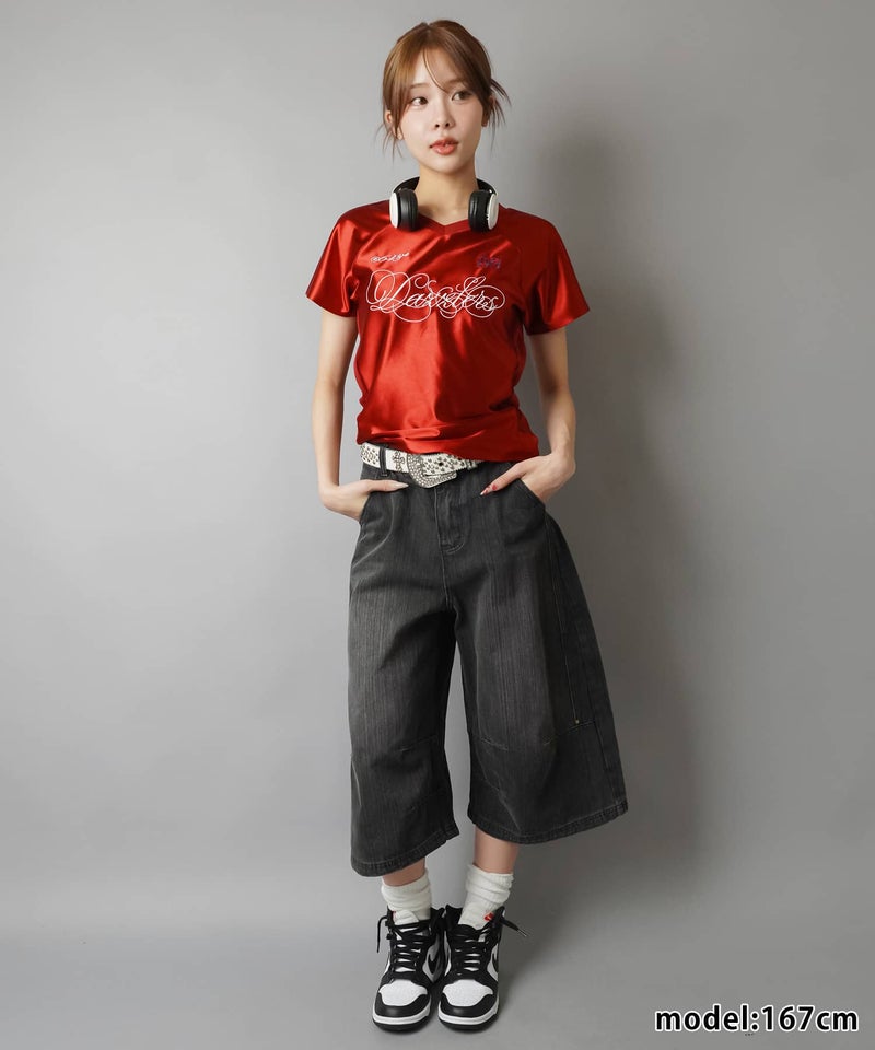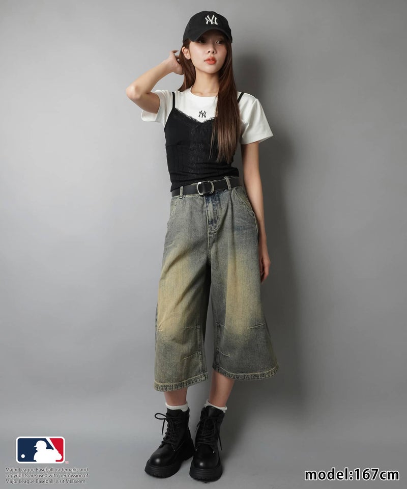 加工感のある色味とボリュームシルエットが目を惹く、旬バランスなデニムハーフパンツ。