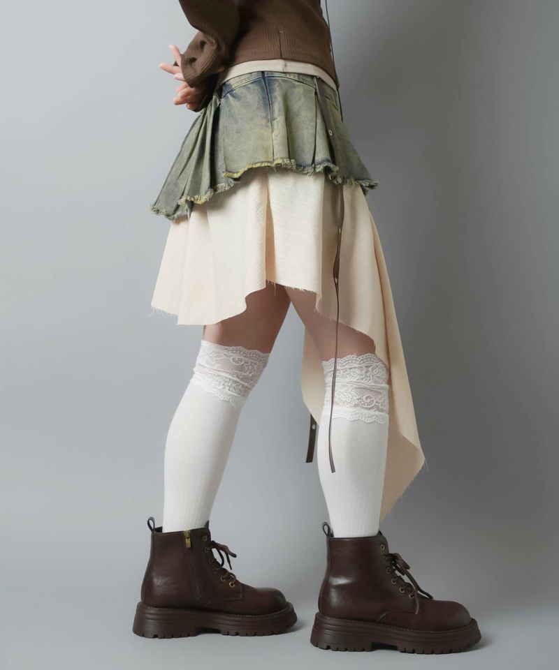 デニム×フリルの異素材を組み合わせた、着るだけで主役級のレイヤード風スカート。