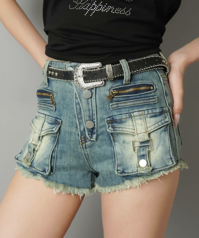 2サイズ展開 デニムショートパンツ/ポケットベルト/フリンジオーバーダイ