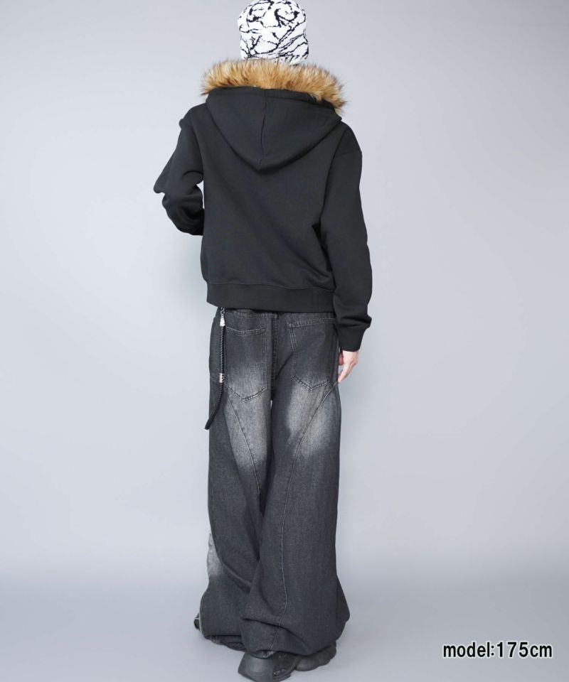 フードには存在感のあるフェイクファーをあしらい、