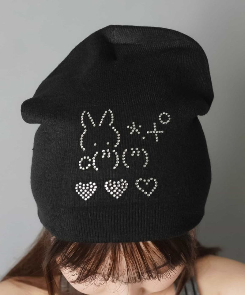 【50%OFF】シングルビーニー/ニット帽/ラインストーンうさぎ/#ウィッシュコア