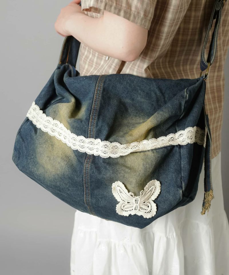 【22%OFF】デニムショルダーバッグ/レースバタフライ/#NEO森ガール