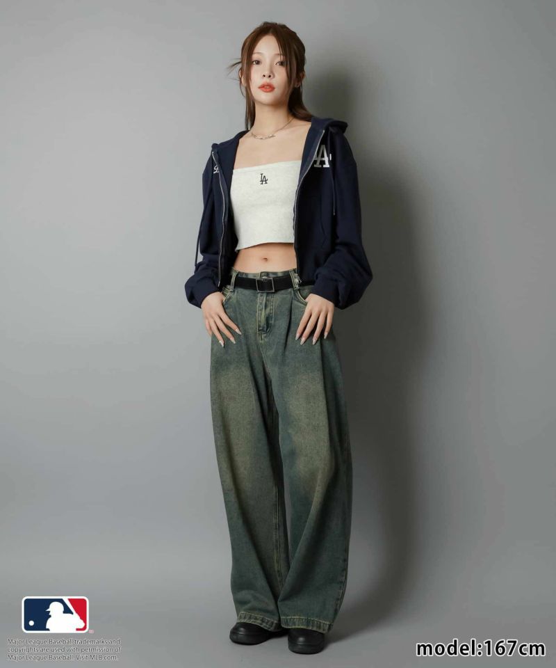 インナーキャミ+MLBジップパーカーをゆるっと羽織ったヘルシーコーデがおすすめ!