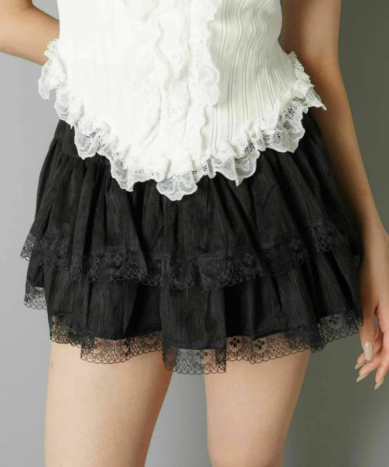 ふわっと広がるフリルで主役感😍 ティアードミニスカート/やわらかレース/インナーパンツ付き