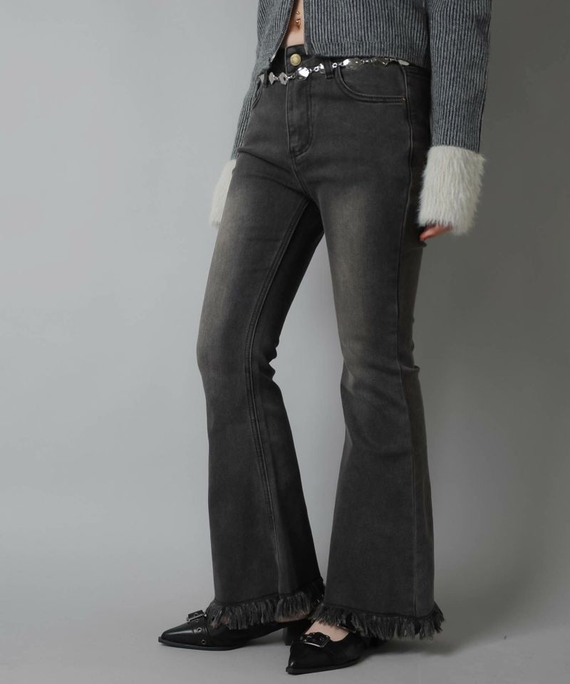 【履くだけで旬なコーデが完成!脚長効果◎フリンジフレアデニムパンツ】