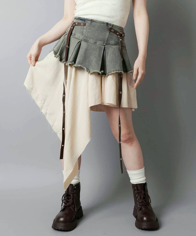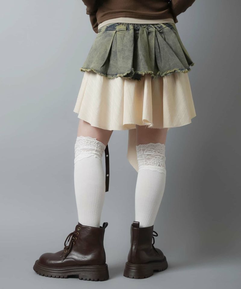 デニム×フリルの異素材を組み合わせた、着るだけで主役級のレイヤード風スカート。