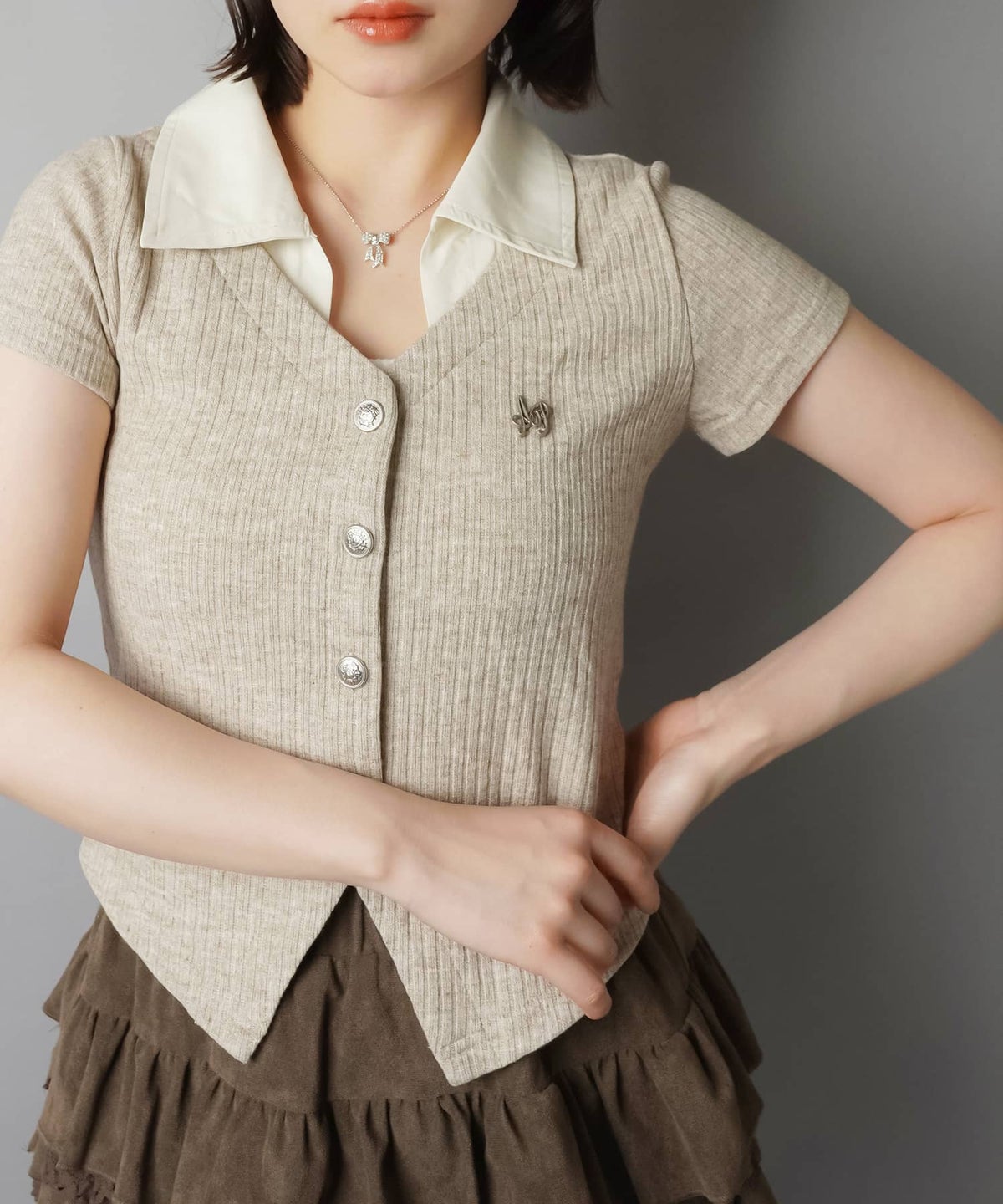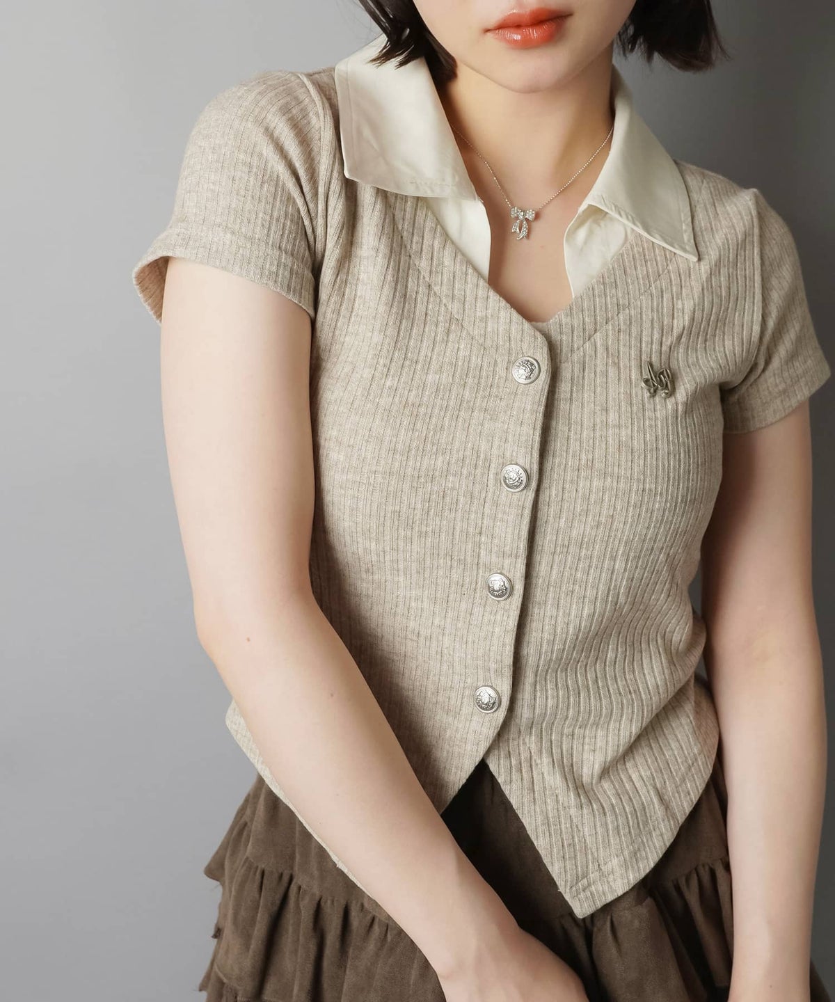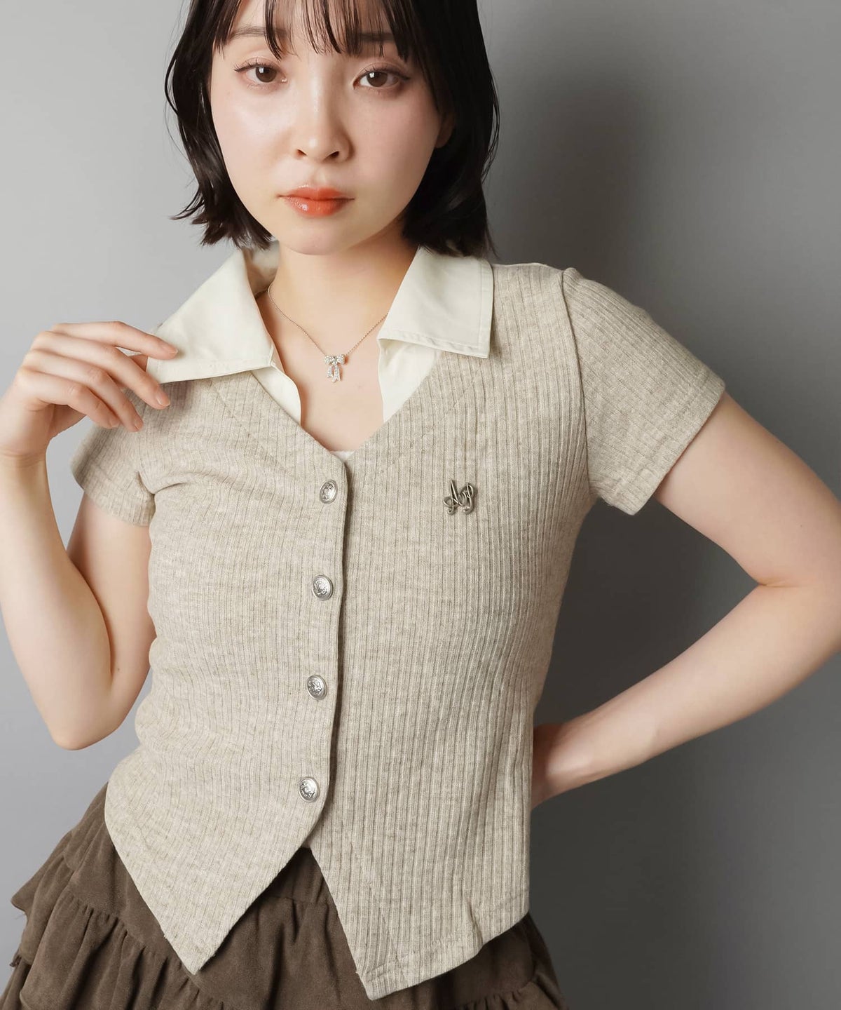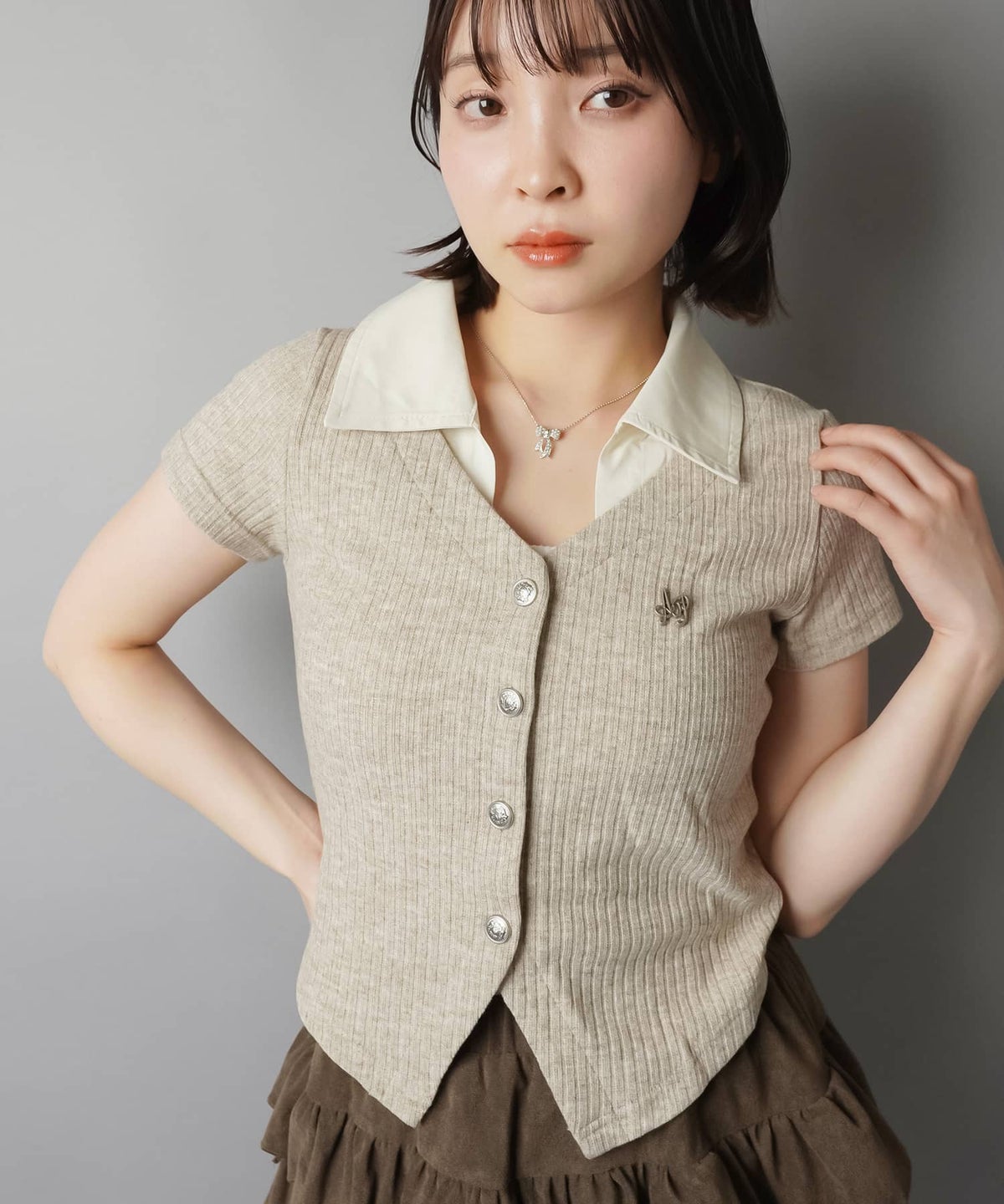 襟やボタンがついたトップスに、プリーツスカート
