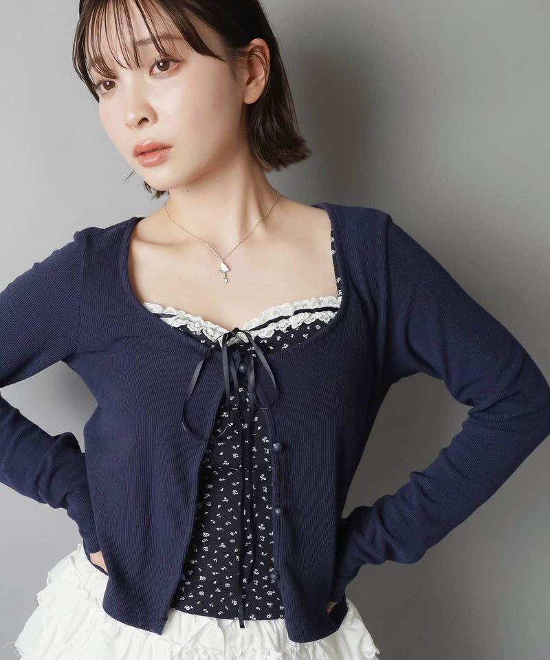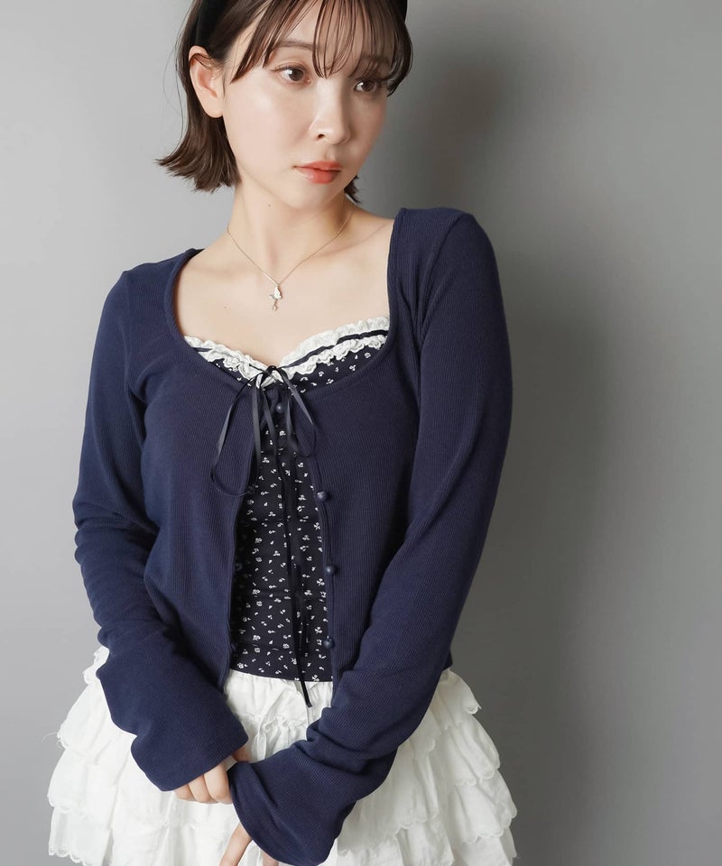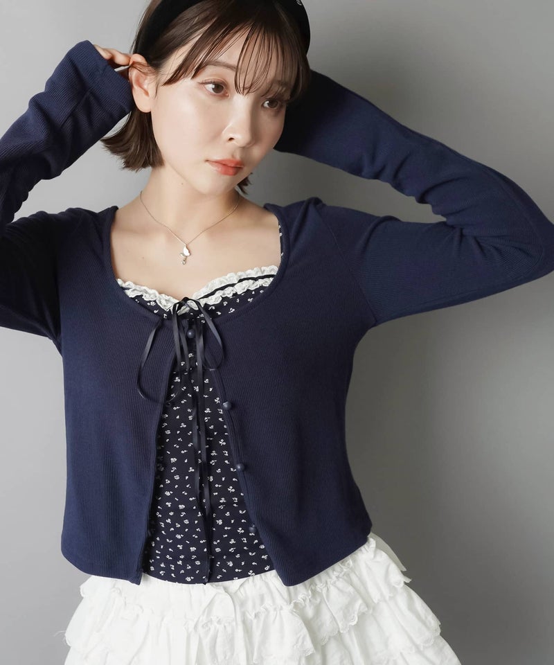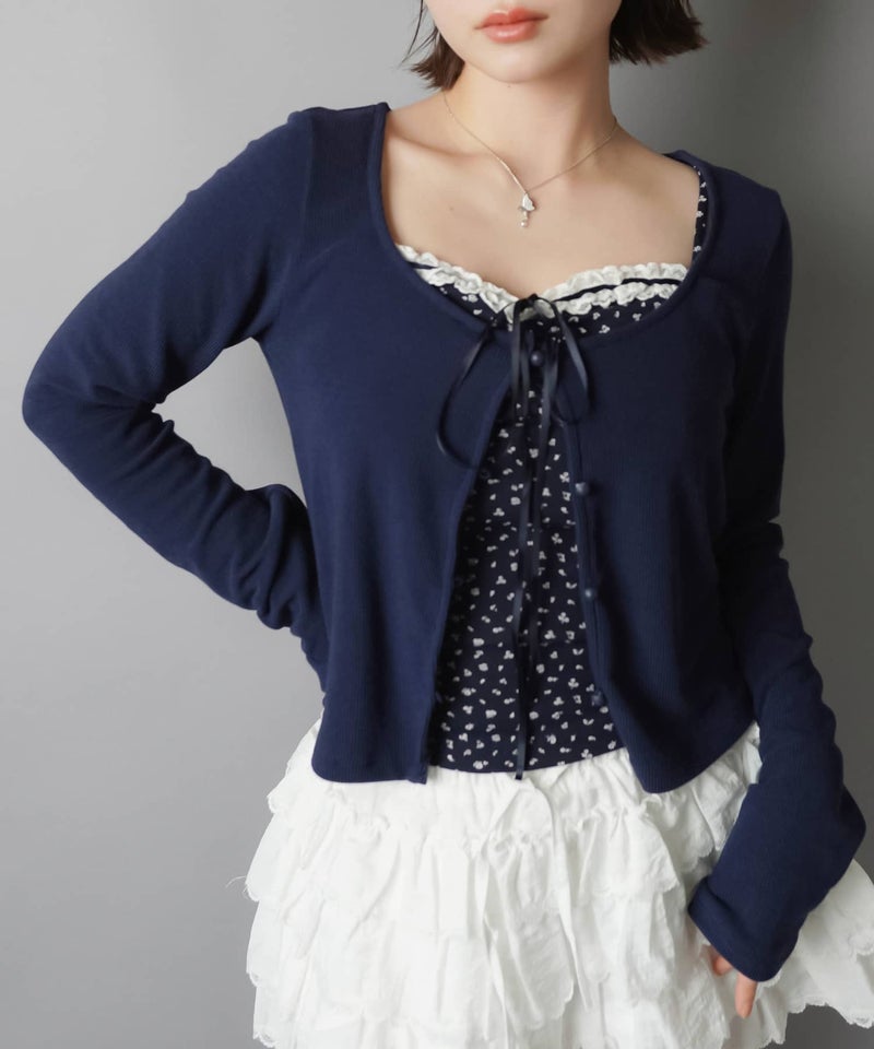 長袖カーディガン+小花柄キャミソールセット/フライス