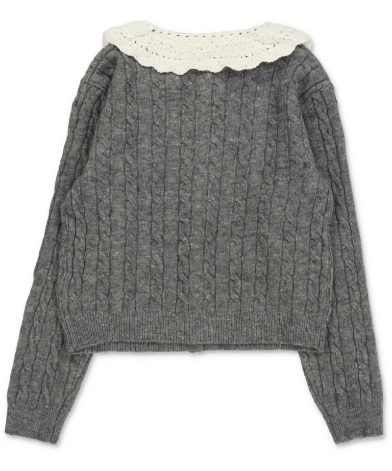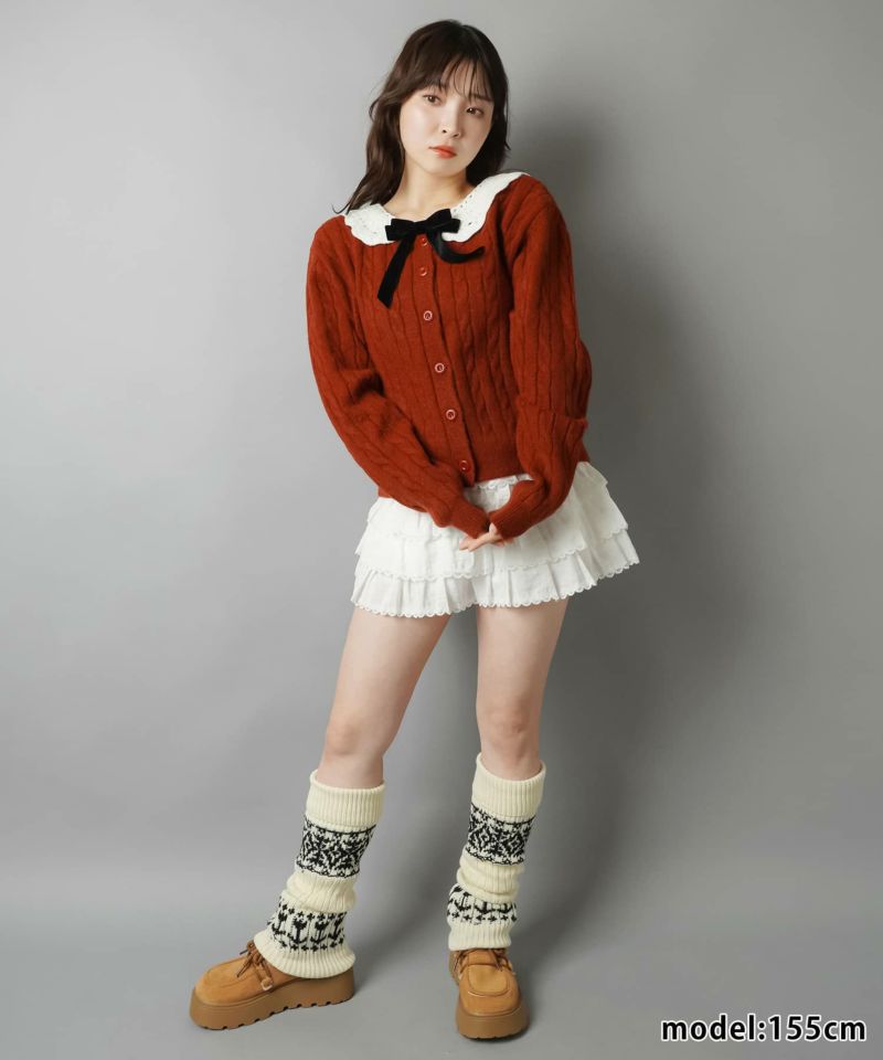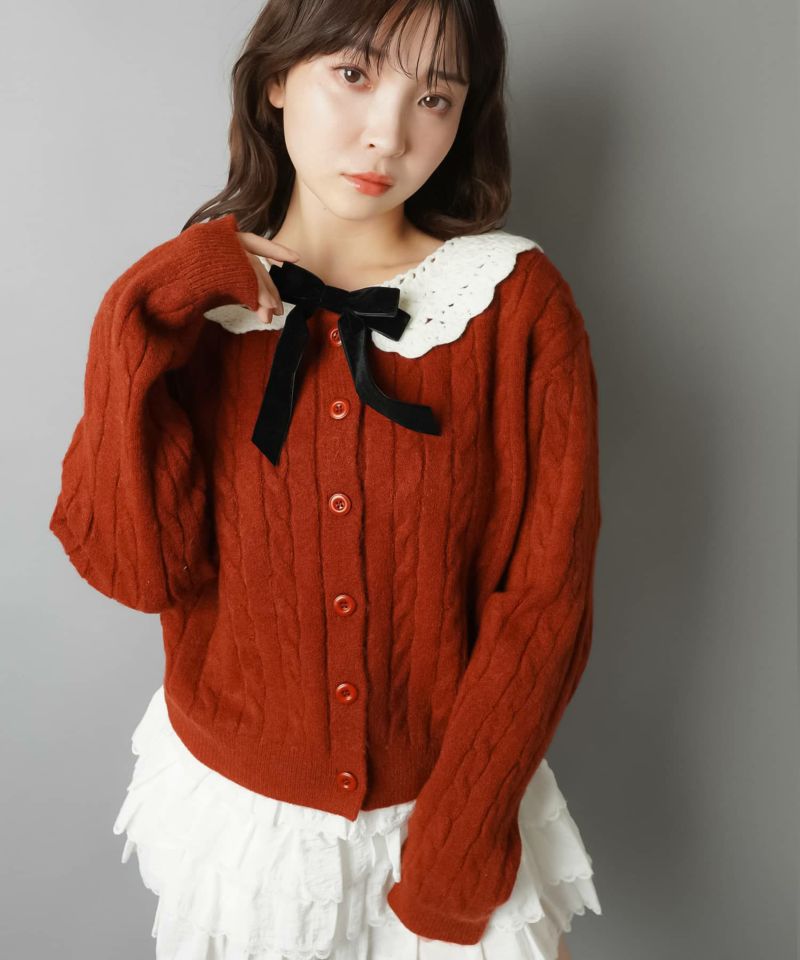 【襟レース×リボンで甘めガーリーな着こなしに♡ケーブル編みが可愛い王道ニットカーディガン】