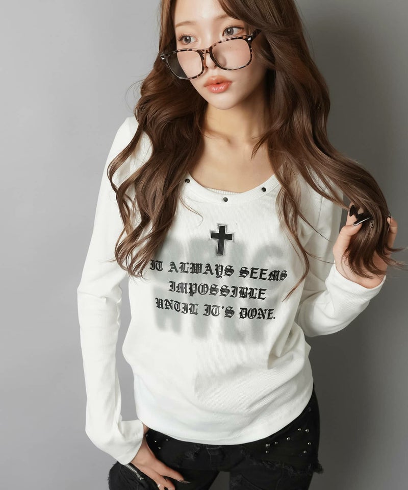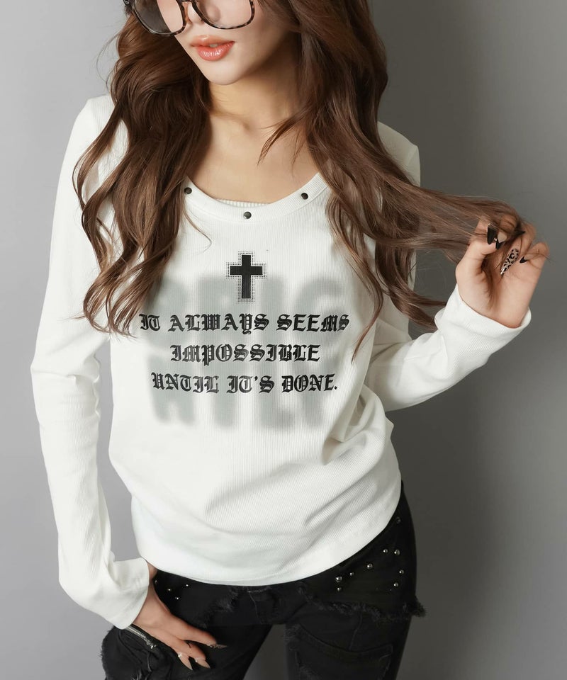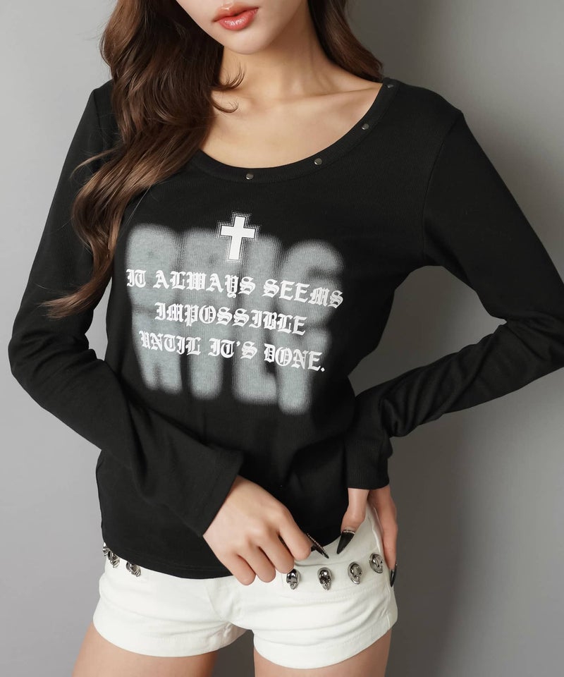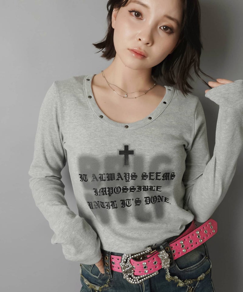 スプレー風ロゴとスタッズディテールでエッジを効かせた、平成ギャルムード漂うロングスリーブトップス。