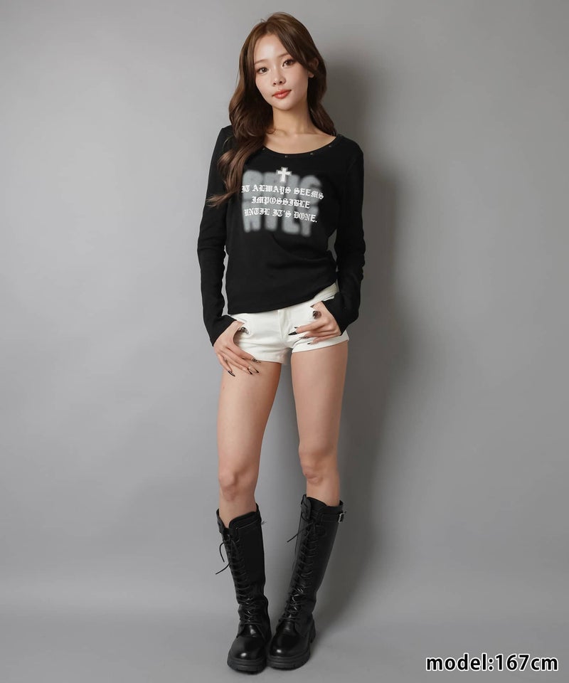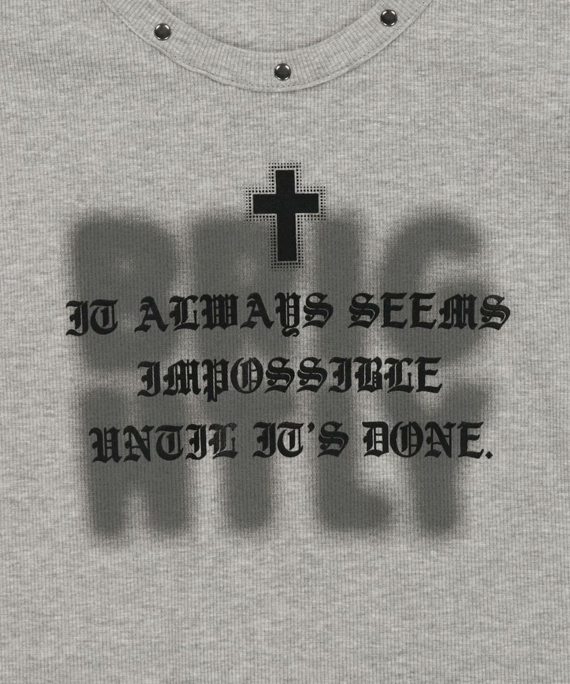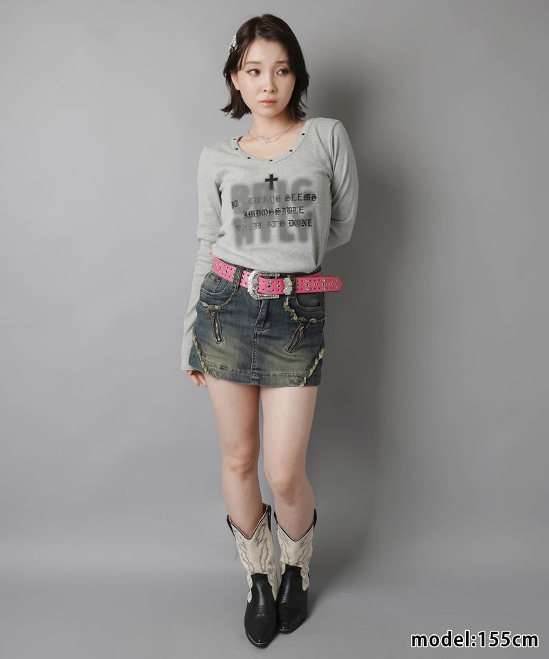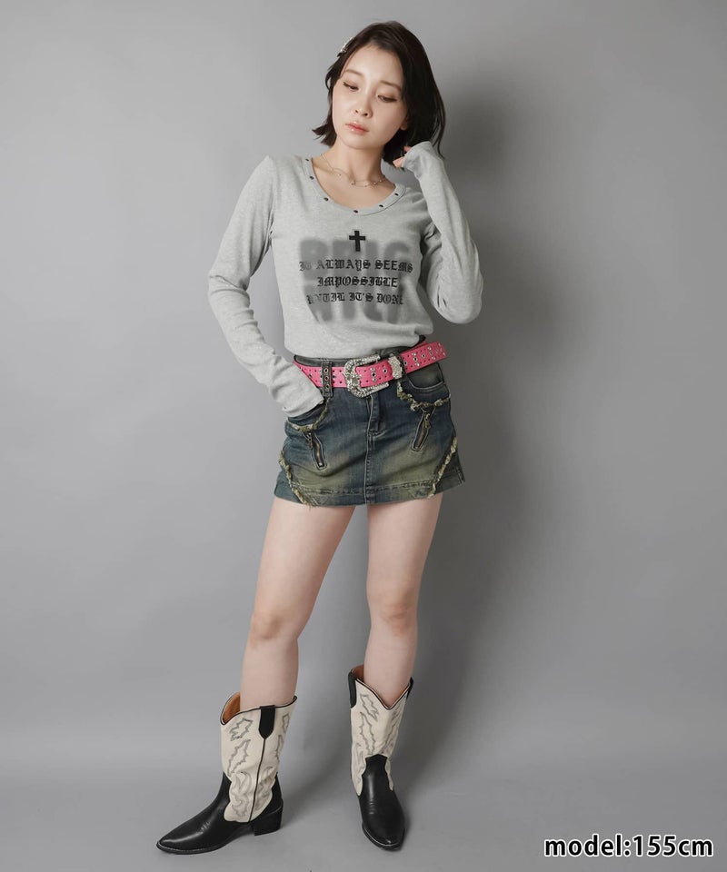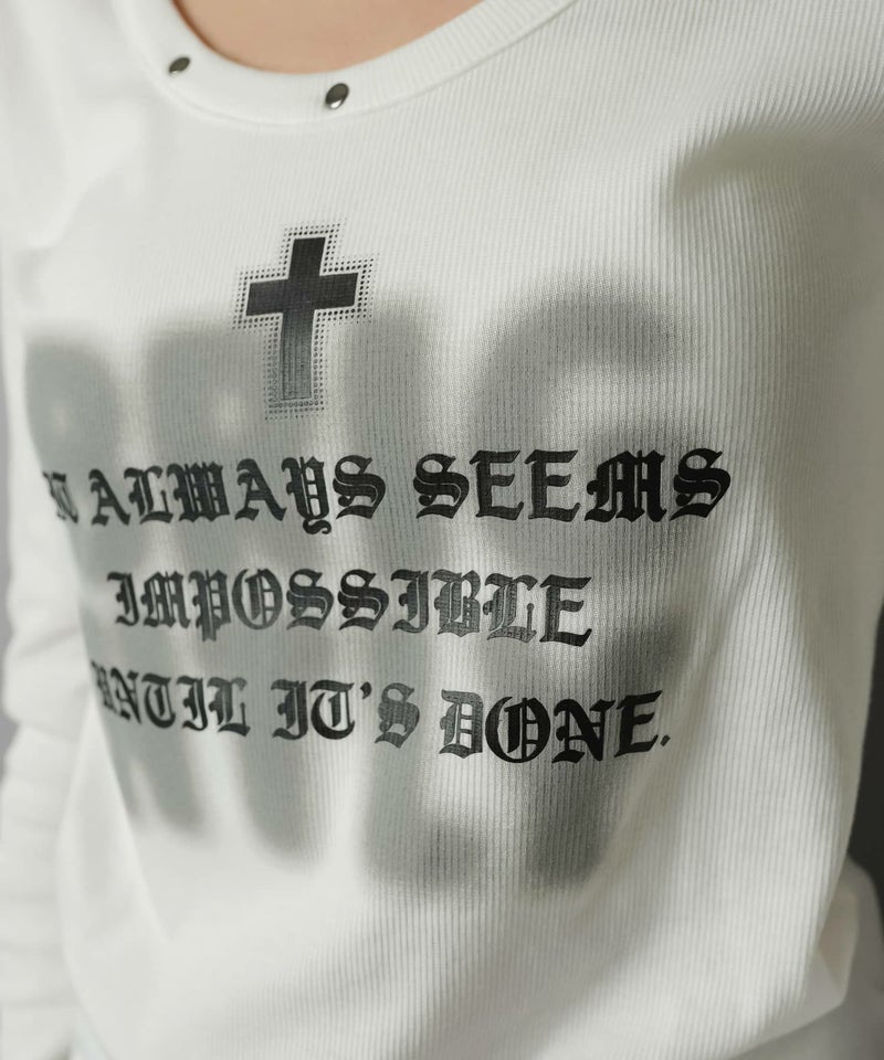 スプレー風ロゴとスタッズディテールでエッジを効かせた、平成ギャルムード漂うロングスリーブトップス。