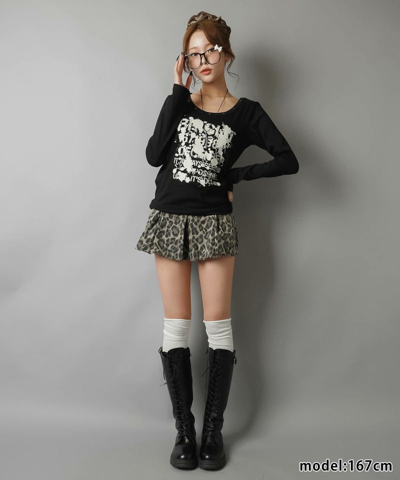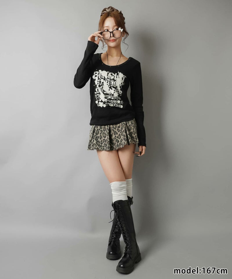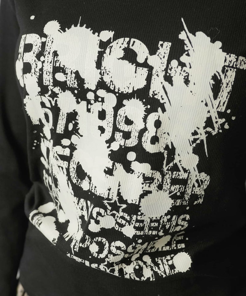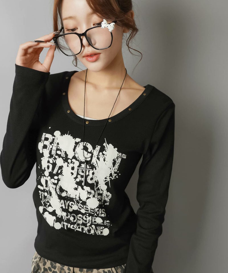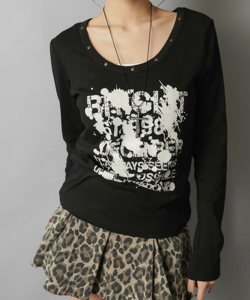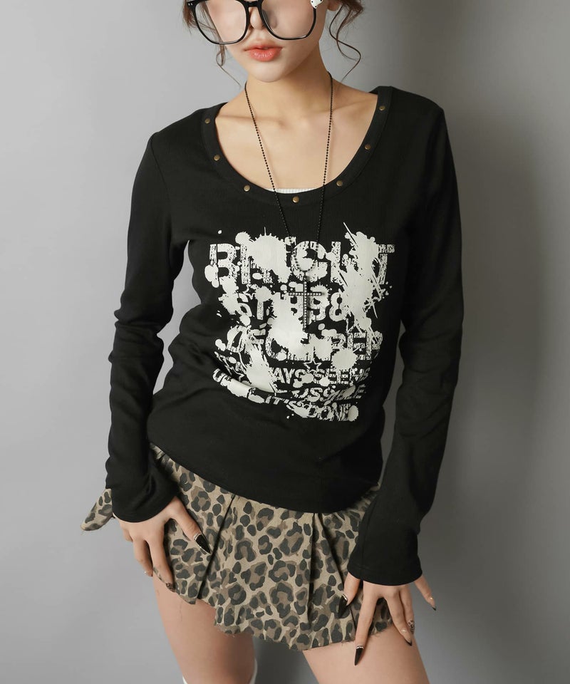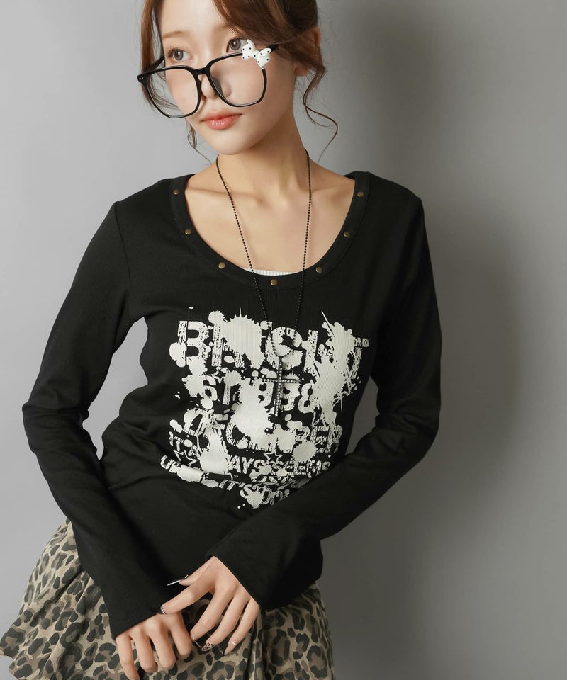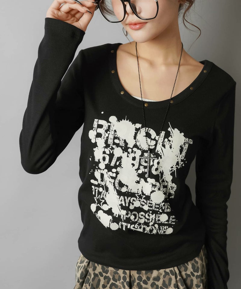 ペイント風ロゴとスタッズディテールでエッジを効かせた、平成ギャルムード全開の主役トップス。