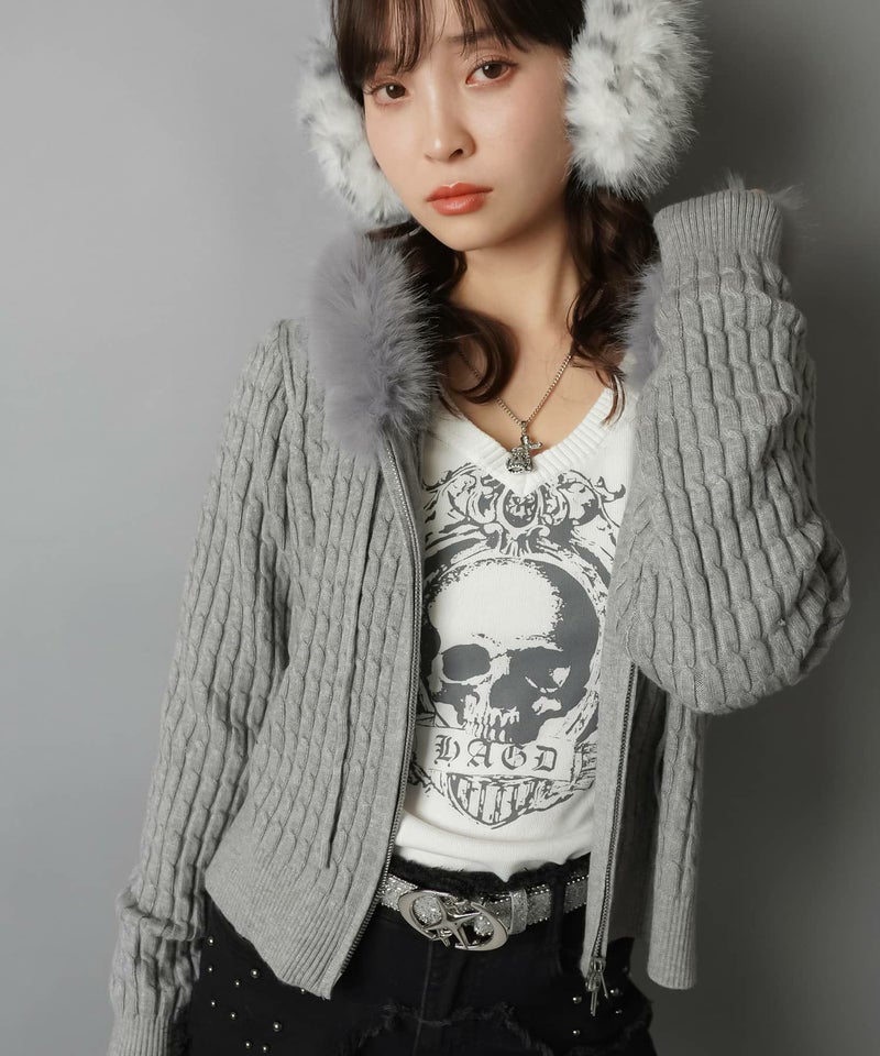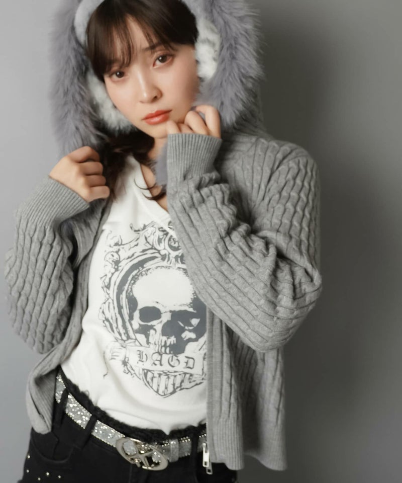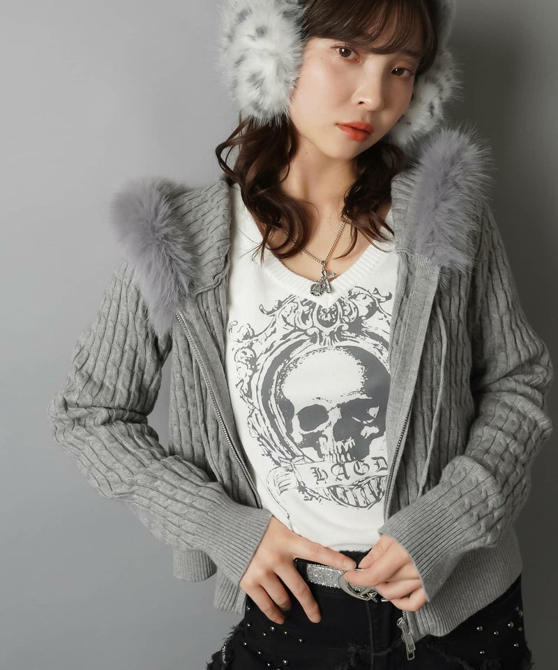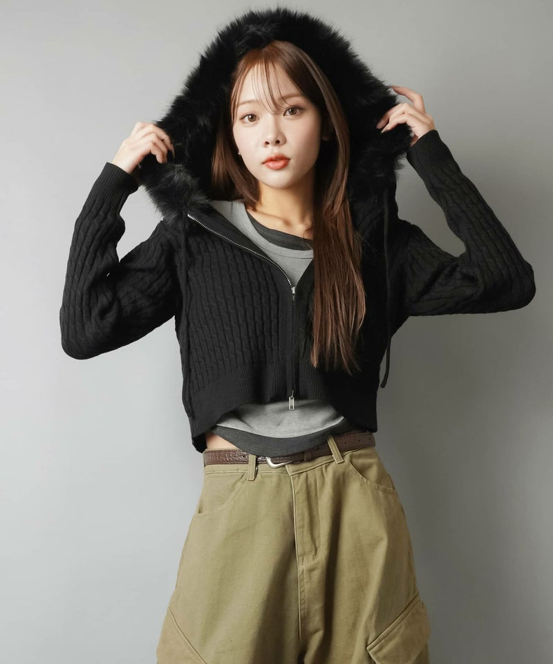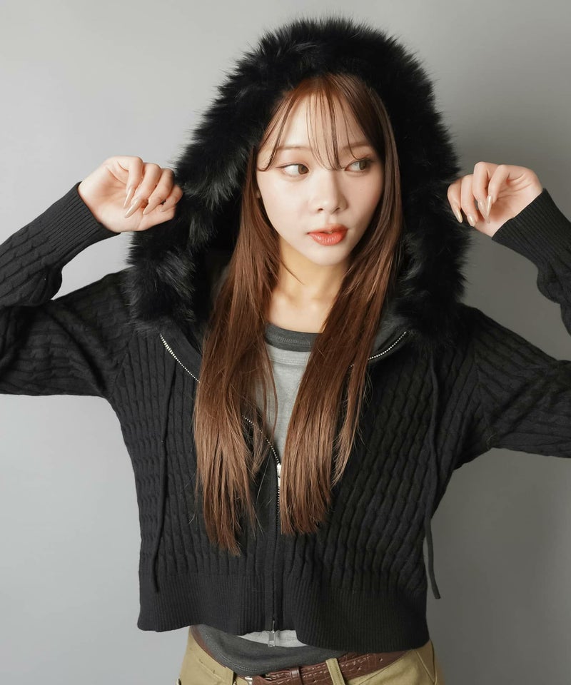ケーブル編みの立体感と、存在感たっぷりのファーフードがポイントのジップニット。
