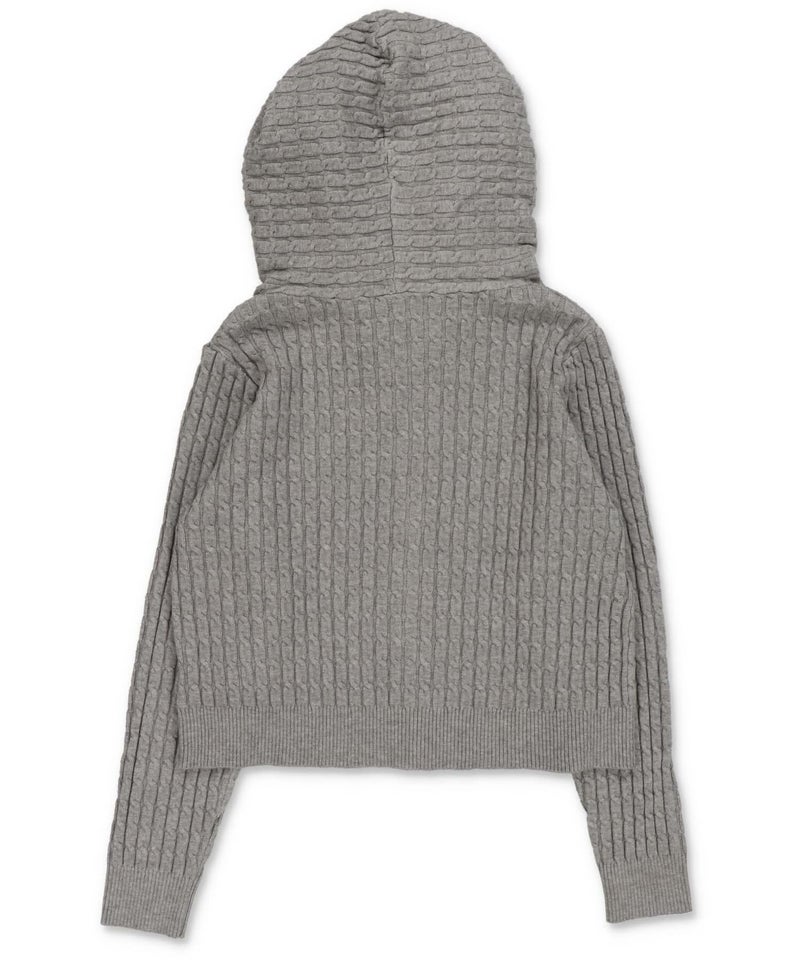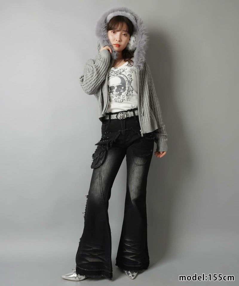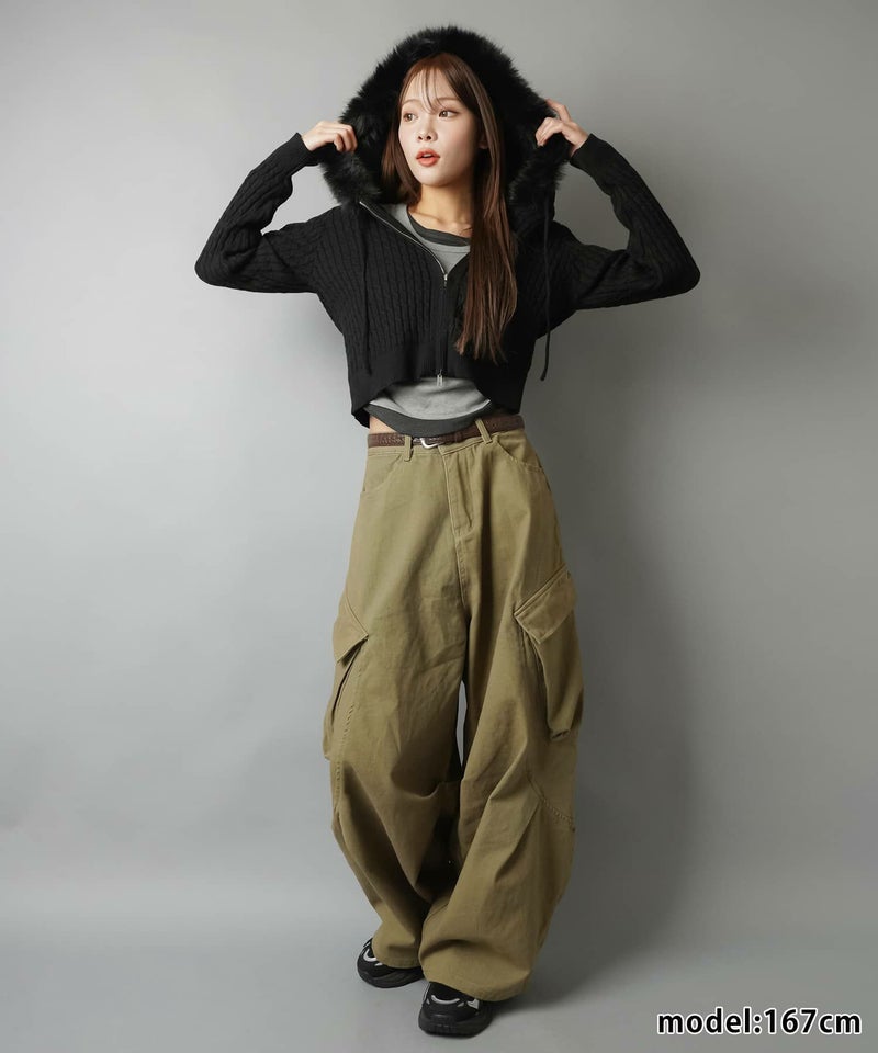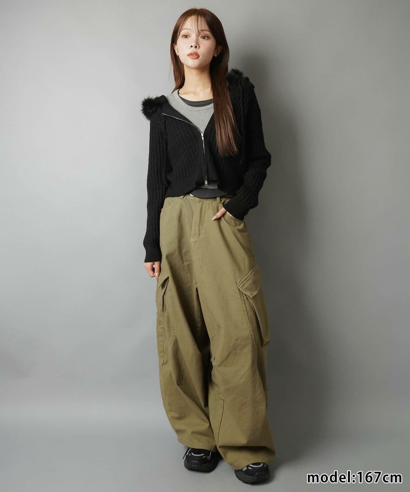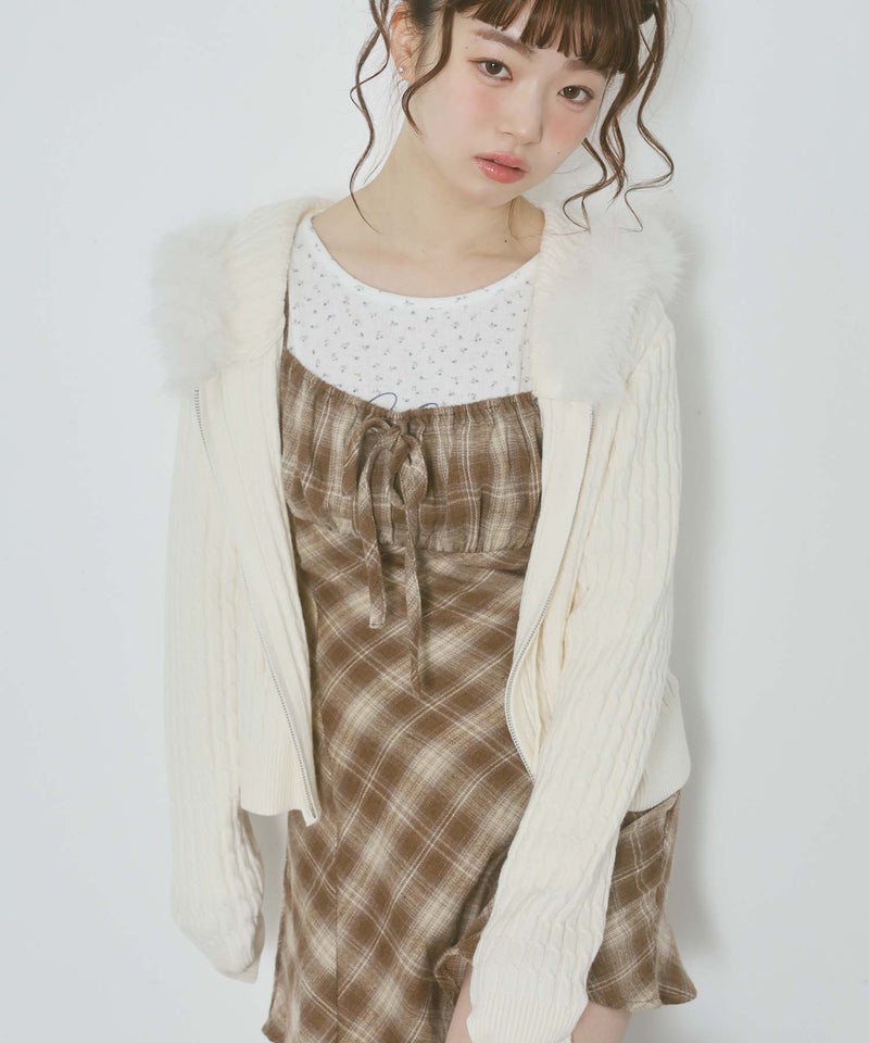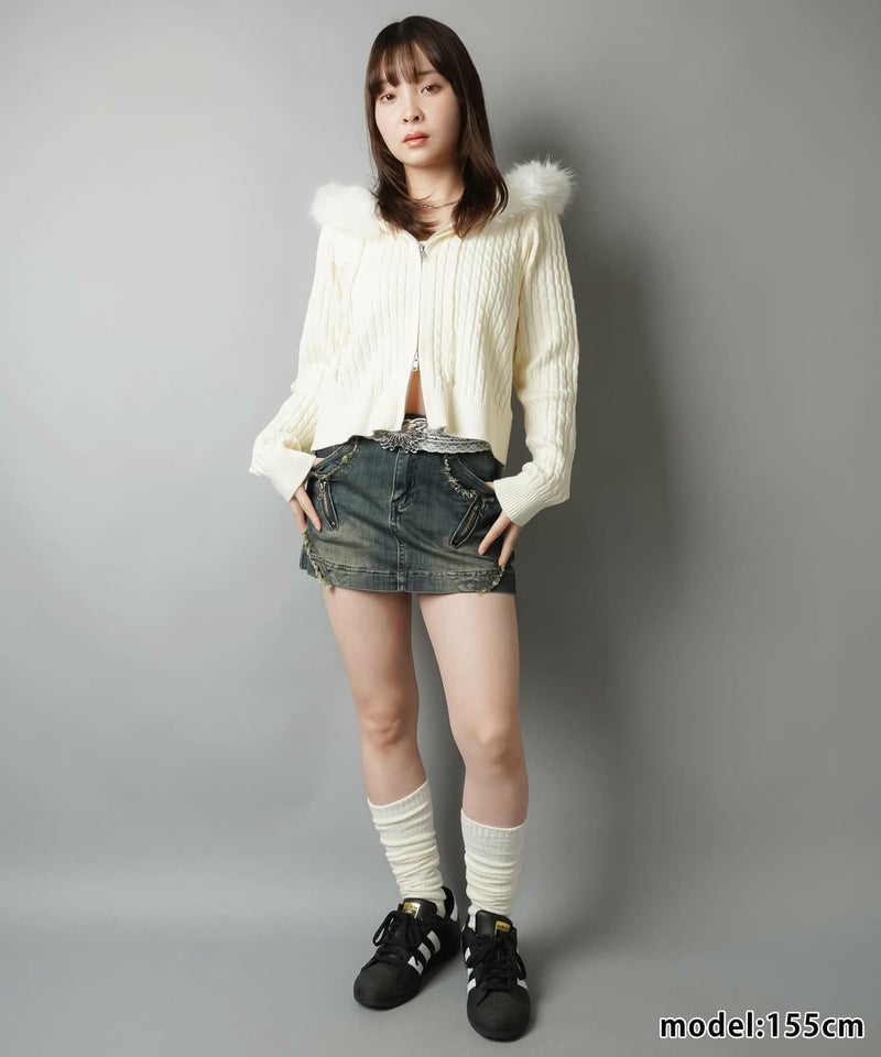 ケーブル編みの立体感と、存在感たっぷりのファーフードがポイントのジップニット。