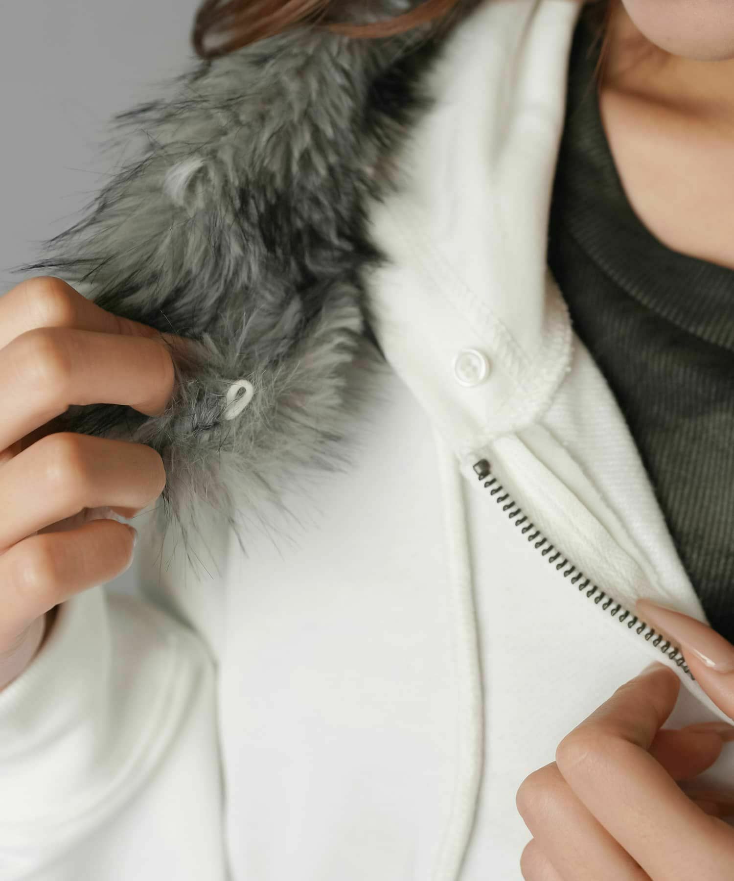 1:フードのフェイクファーがミックスでギャル感UP