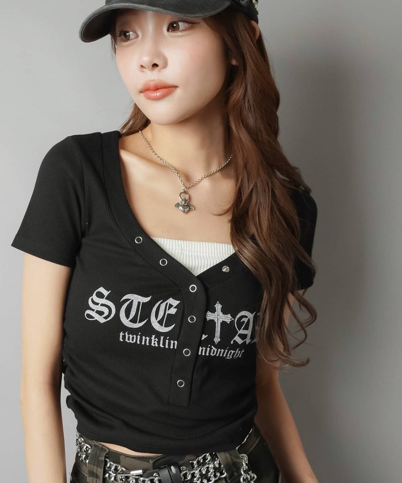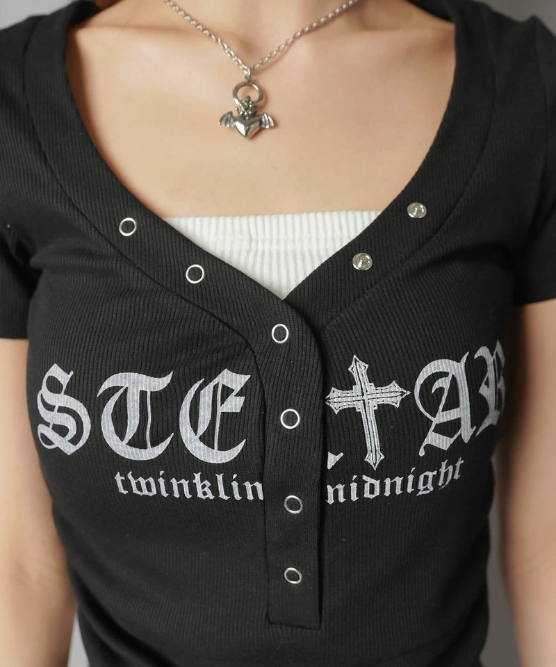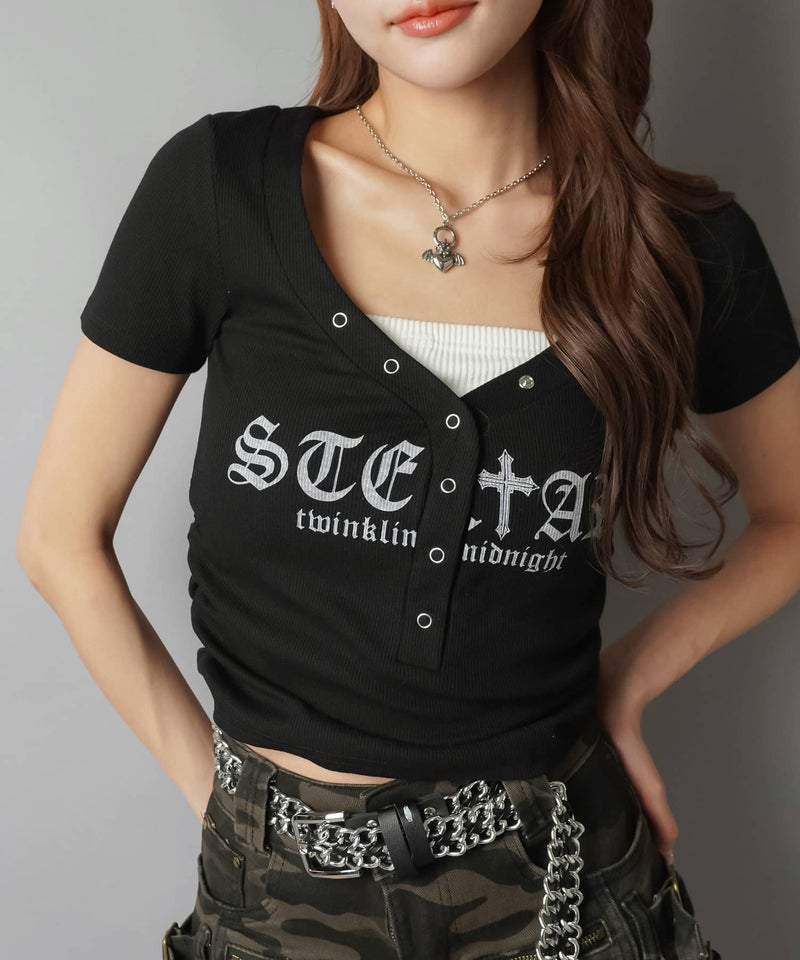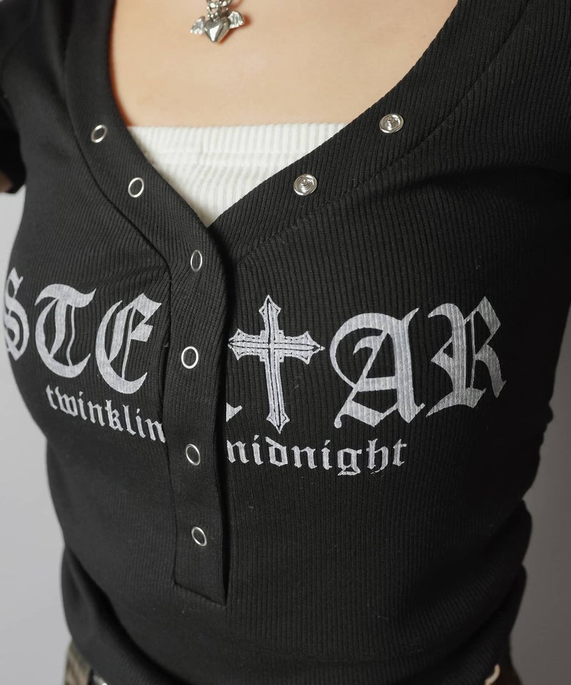 ヘンリーネック半袖Tシャツ/オールドイングリッシュロゴ/カモ柄/#平成ギャル