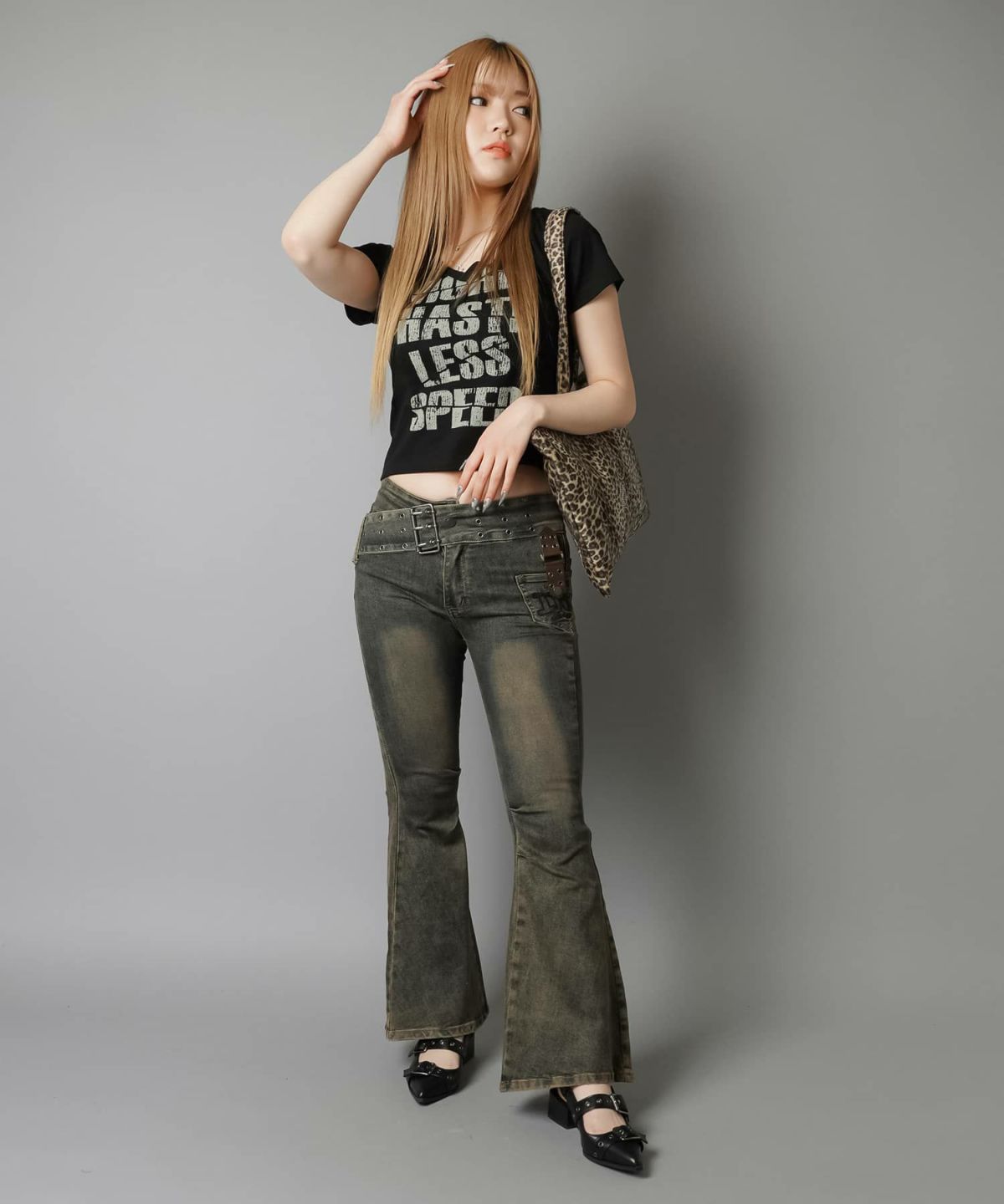 ミニスカート、フレアパンツ、クロップド丈、へそ出し、厚底、