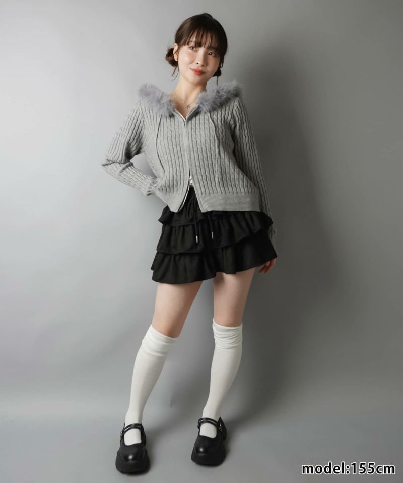 ケーブル編みの立体感と、存在感たっぷりのファーフードがポイントのジップニット。