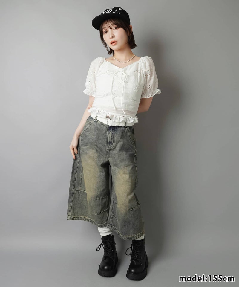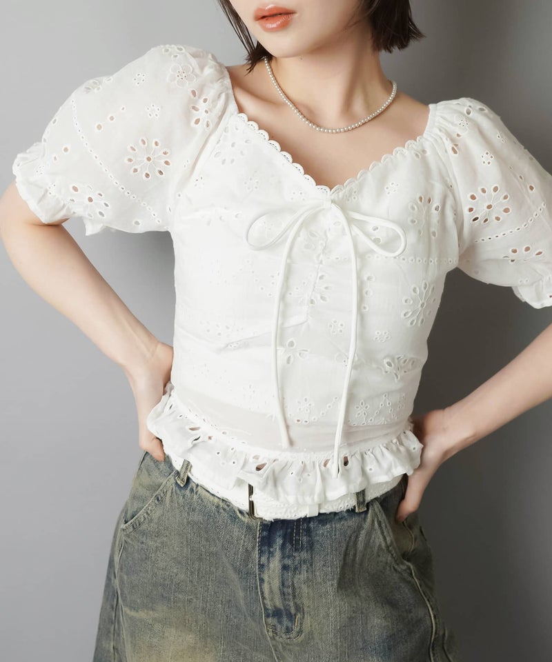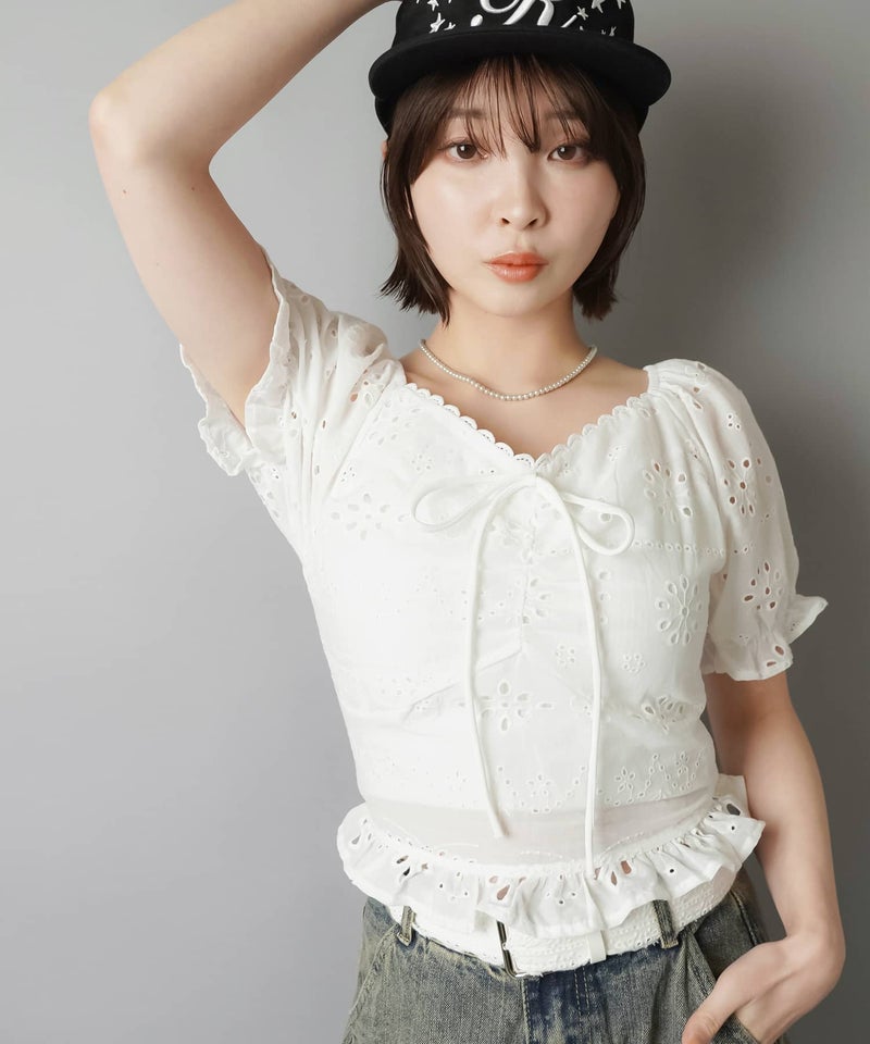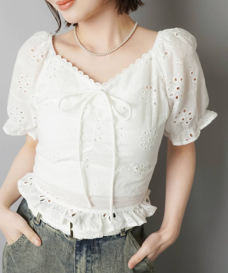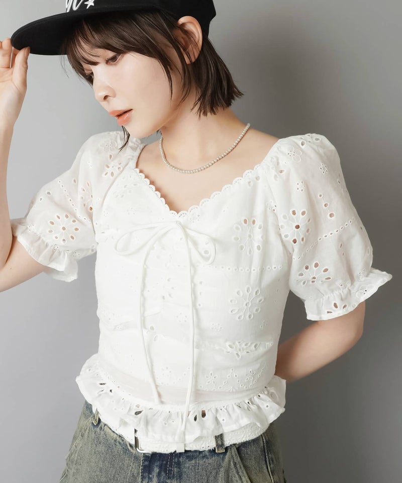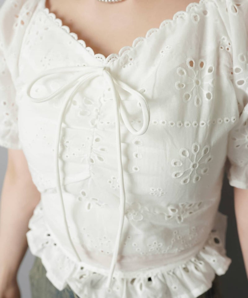 半袖ブラウス/コットンレースリボン