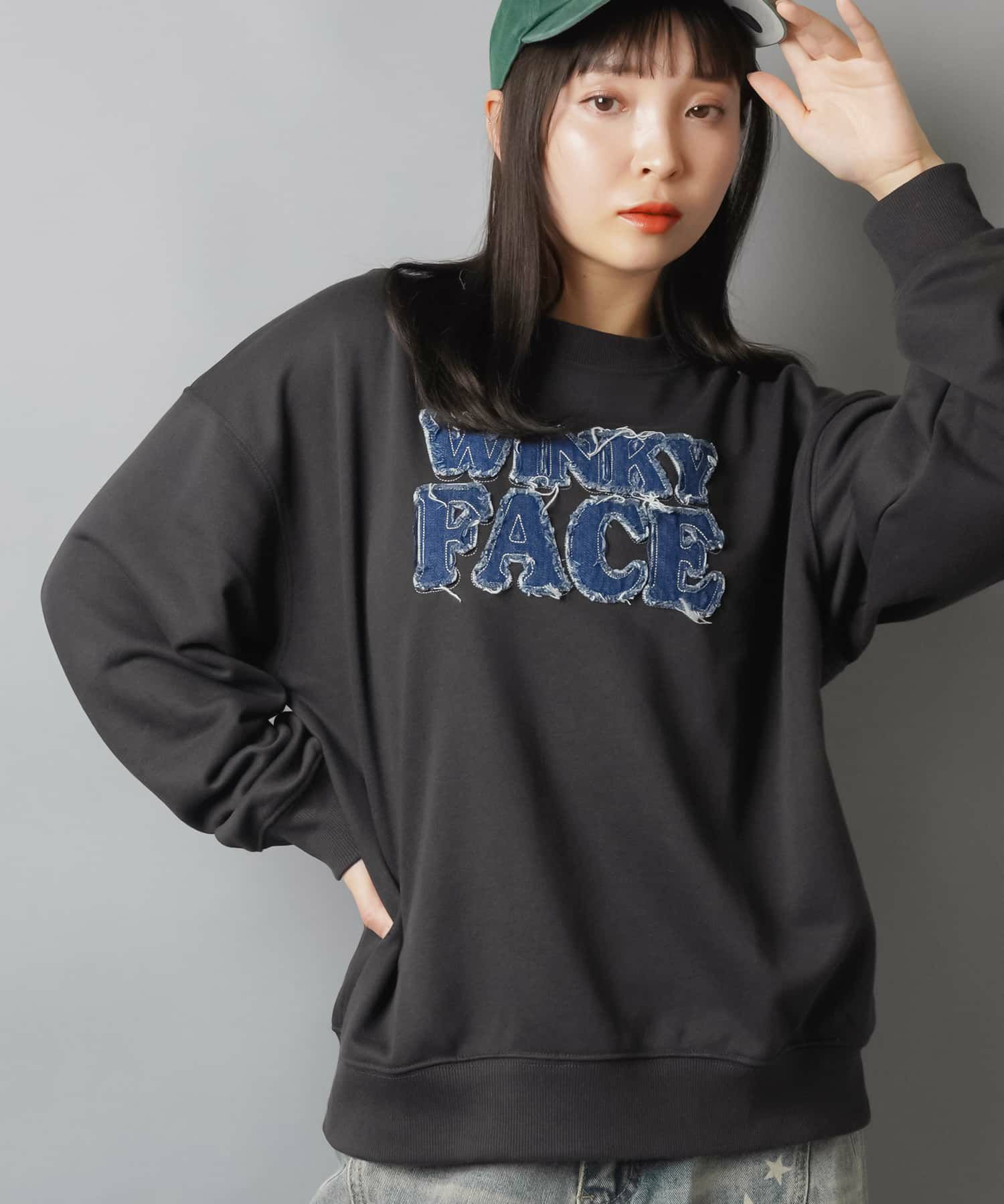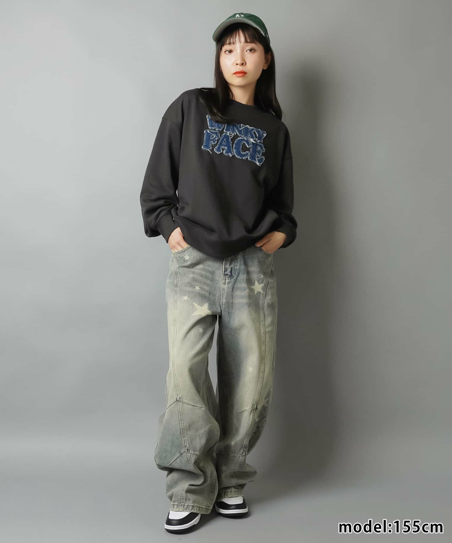 裏毛長袖スウェット/デニム貼り付けロゴ/2段