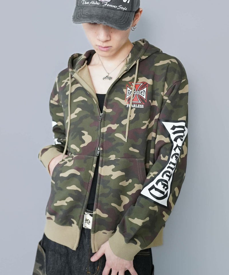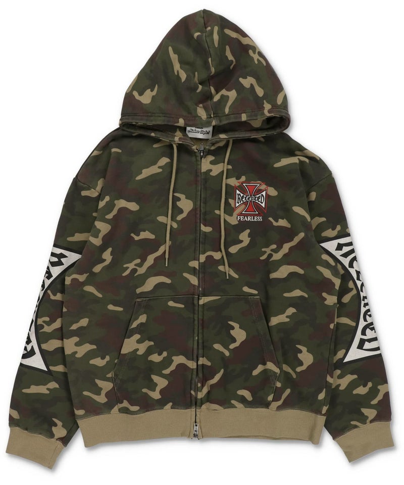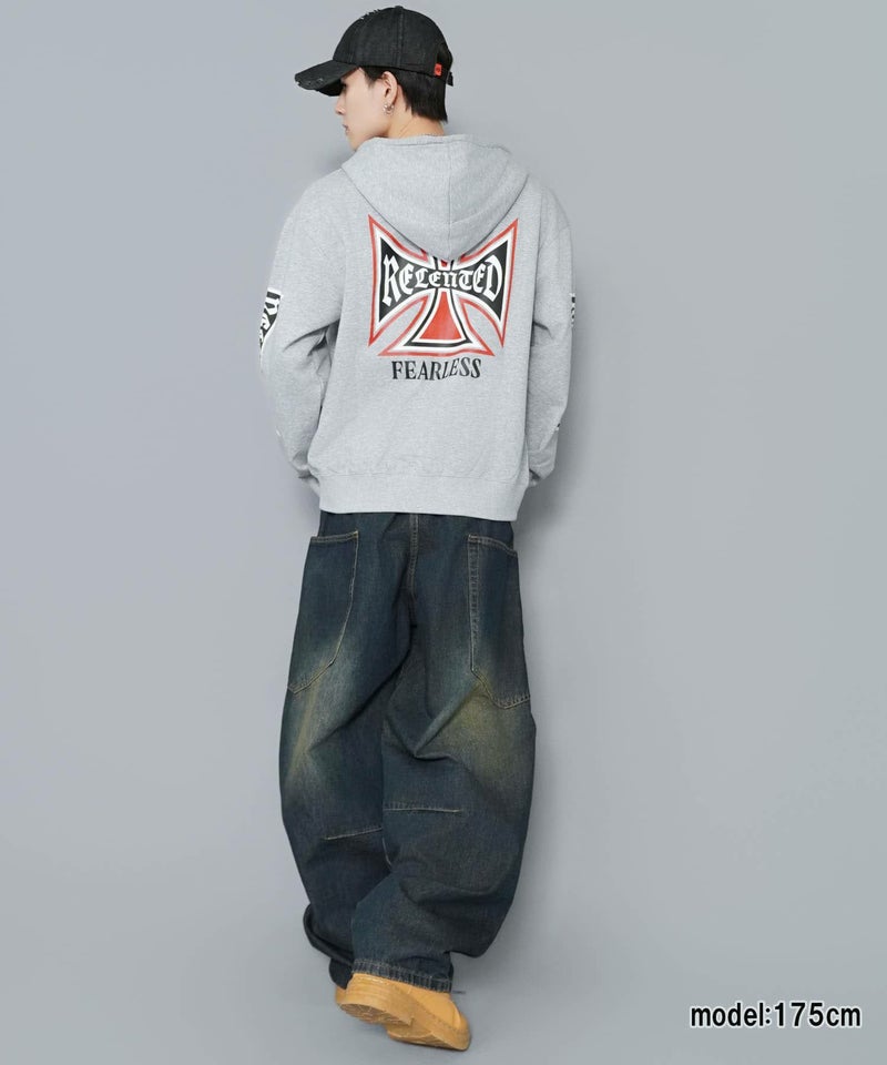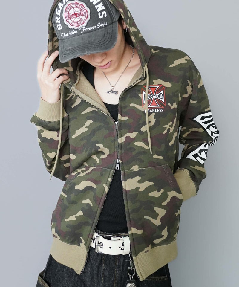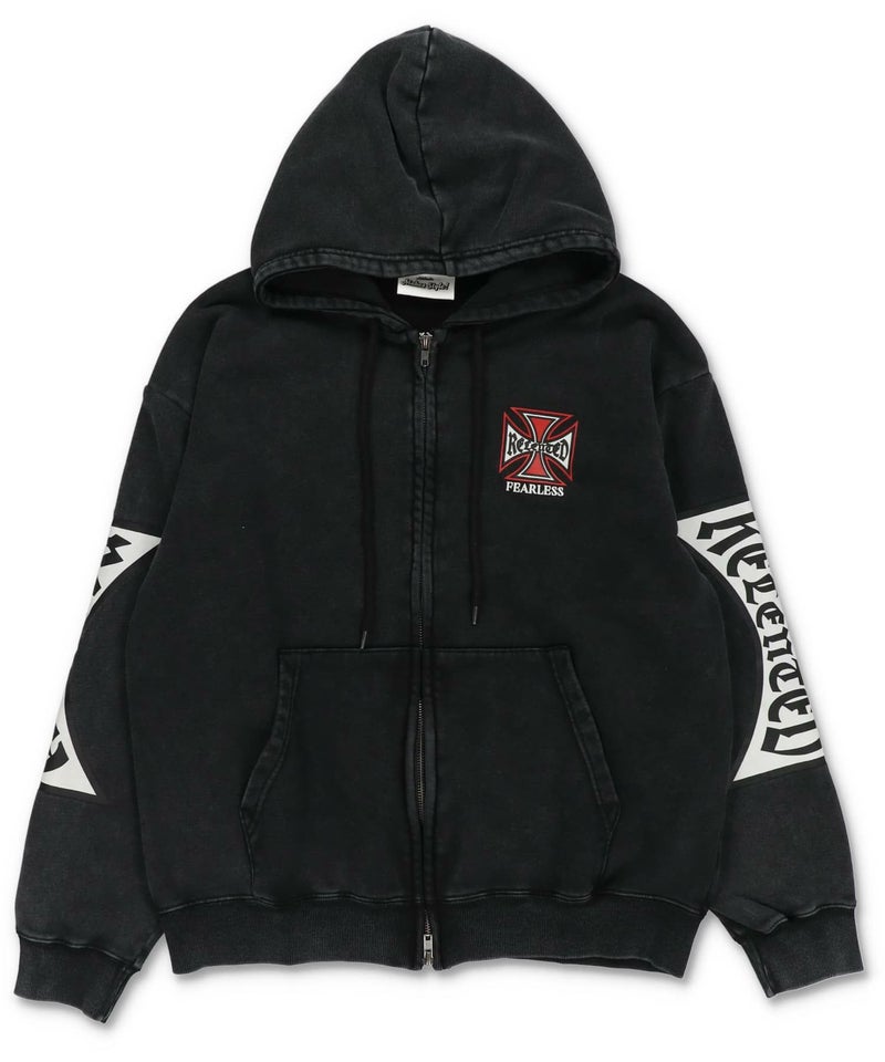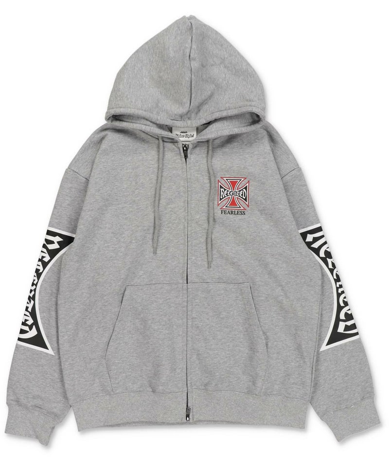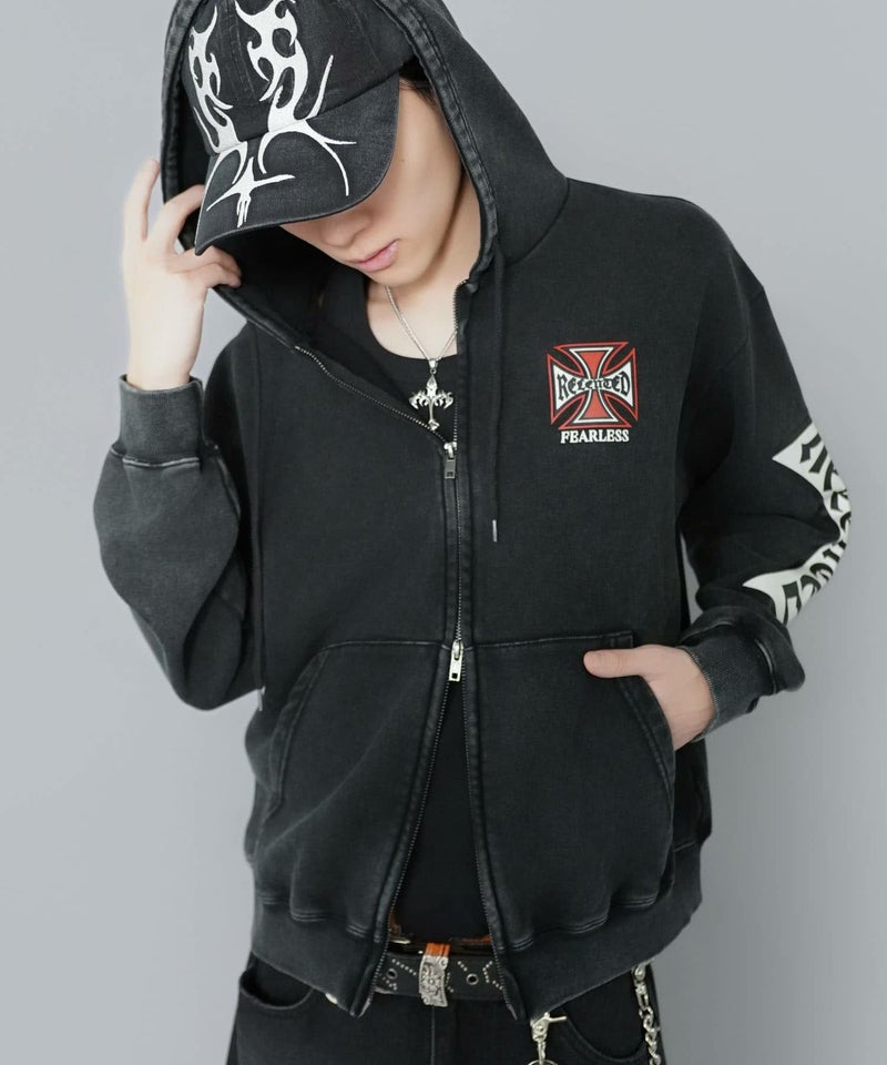 袖ロゴデザインが目を引くダブルジップパーカー。