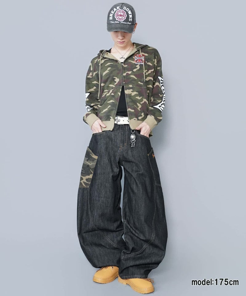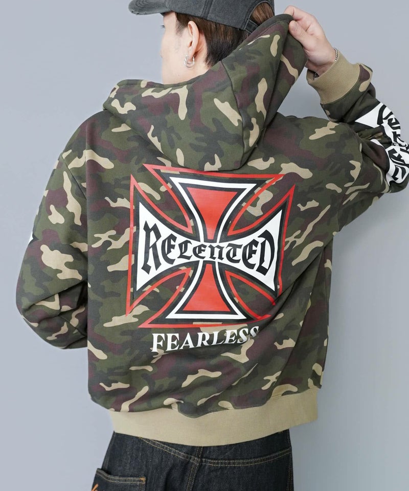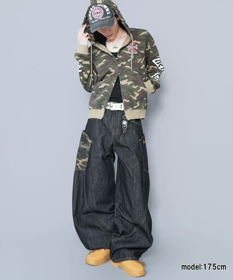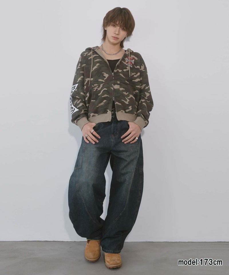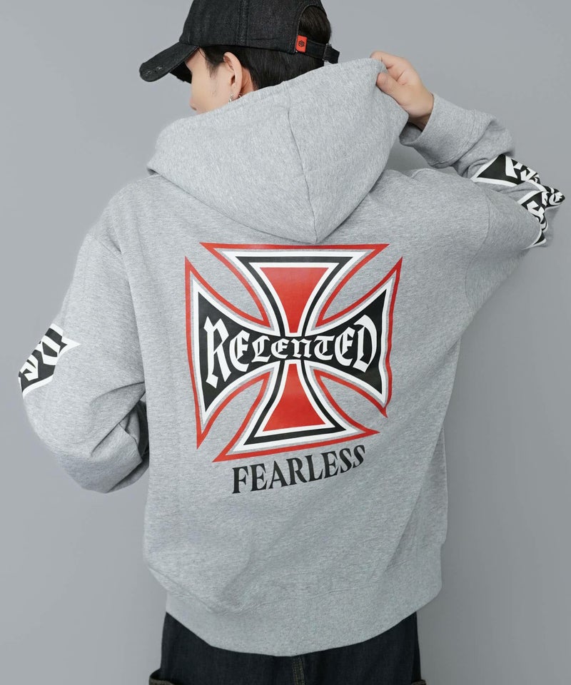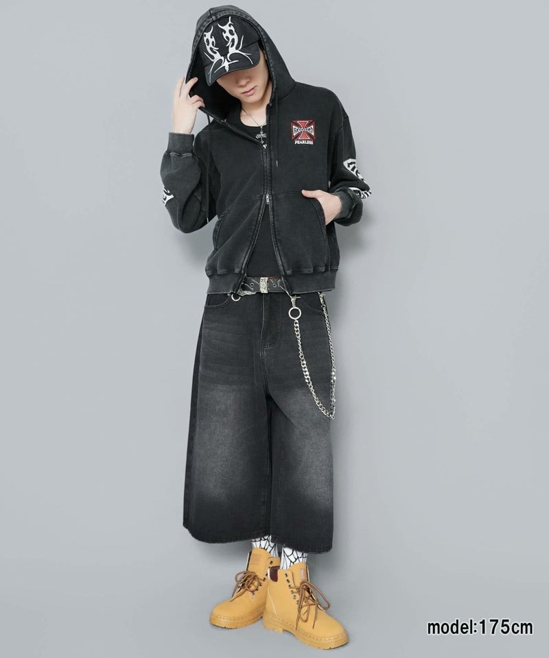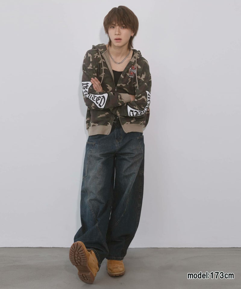 袖ロゴデザインが目を引くダブルジップパーカー。